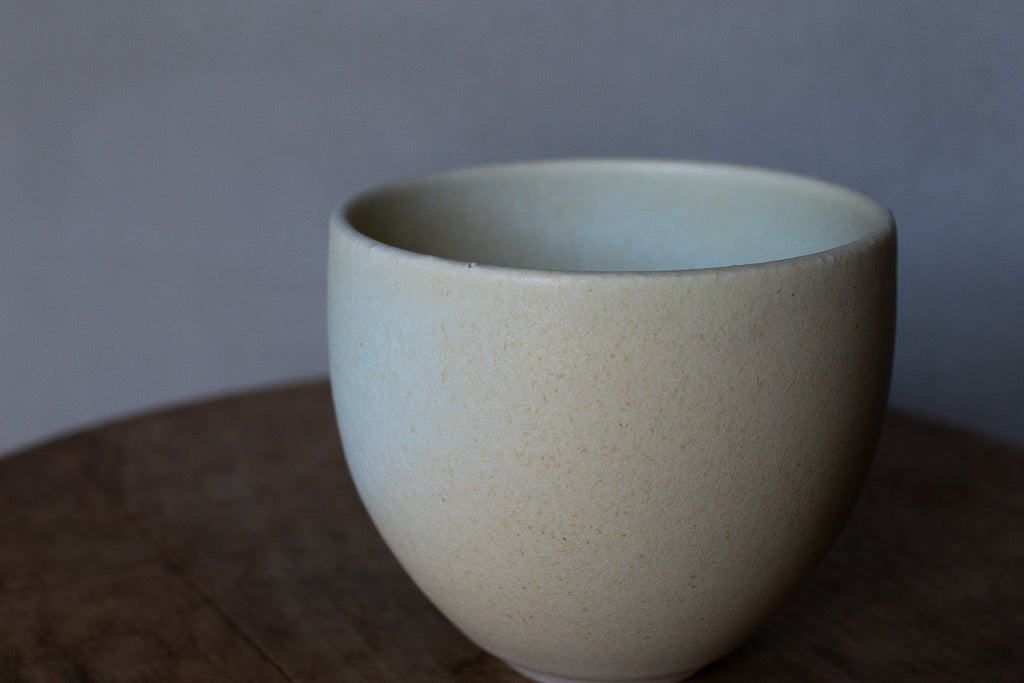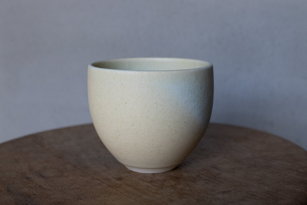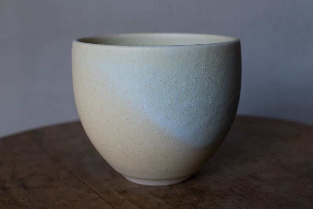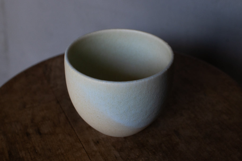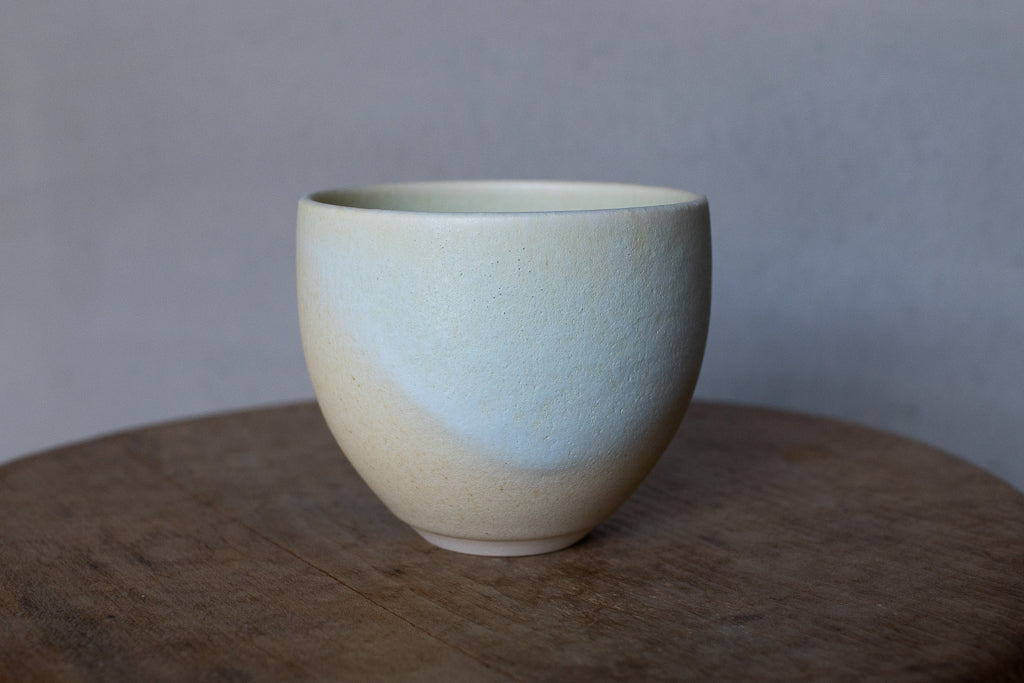 2024年春の個展出展作品。春らしい柔らかなツートンカラーの色彩が美しいカップです。しっかり容量があるので、湯呑みに限らずあらゆるドリンクにお使いいただけそうです。お使いになる全ての釉薬を自身で調合しており、同業者からも畏敬の念を込めて”変態”と呼ばれるほどだという馬場さん。奇跡的な色彩をお楽しみください。