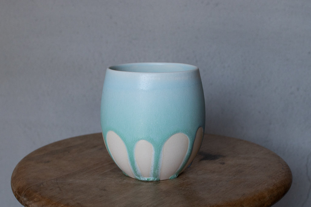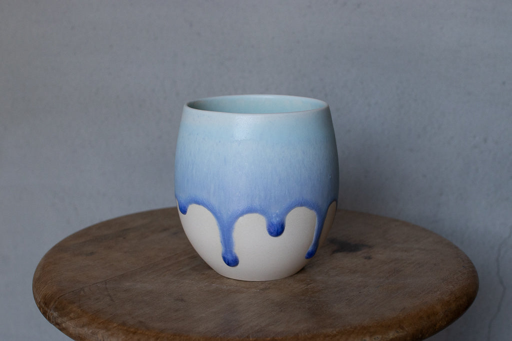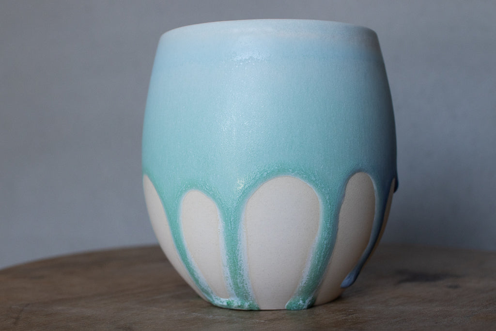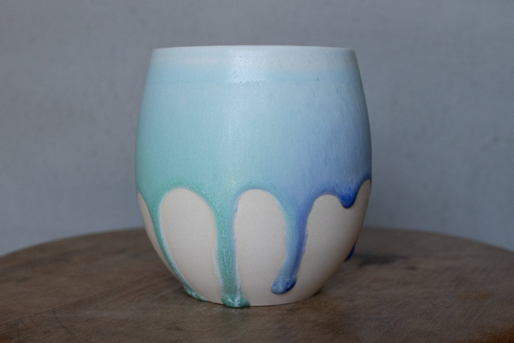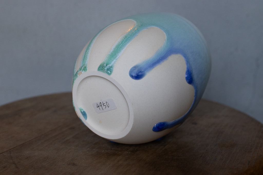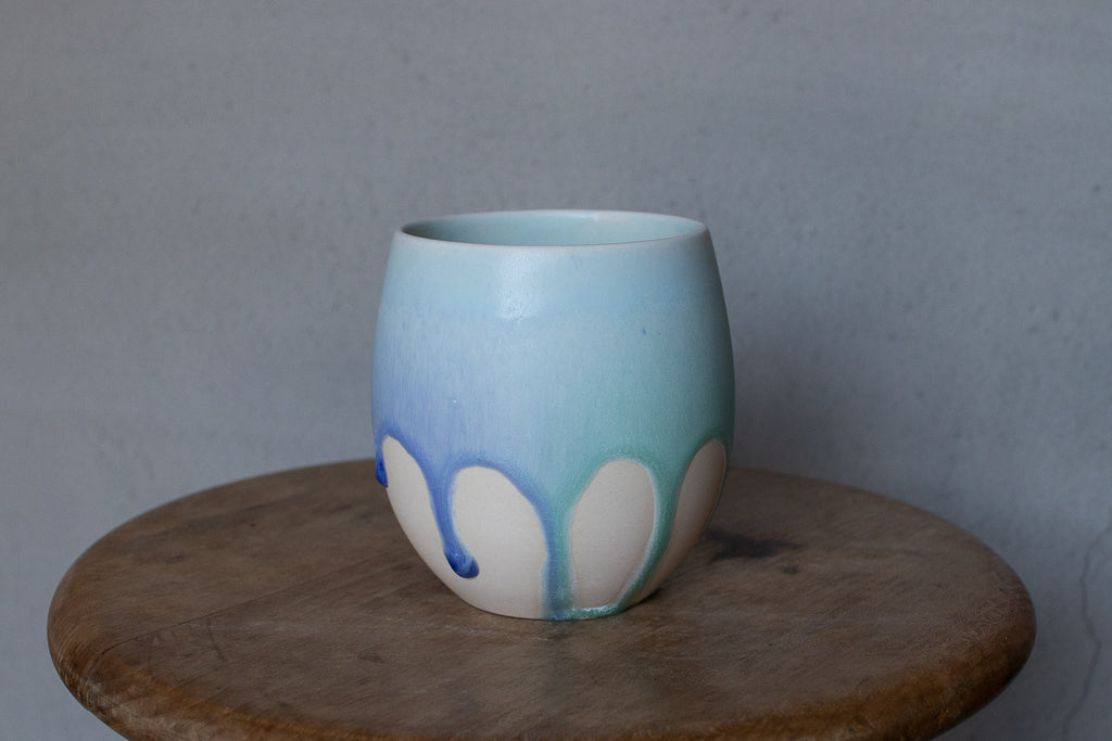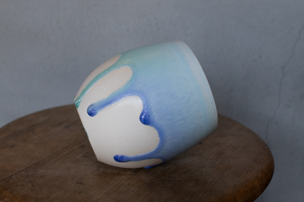 24年春の個展の際にも大人気だった釉薬がとろっと垂れたようなシリーズが再入荷しました。場所によってブルーからエメラルドグリーンまで、美しいグラデーションの表情を見せています。