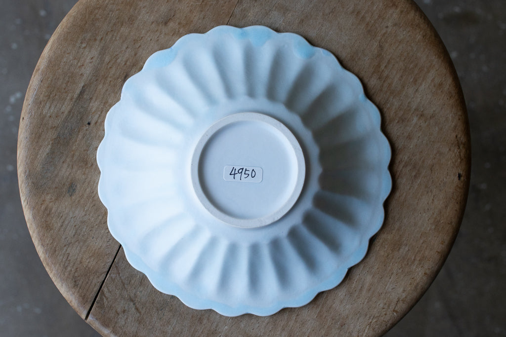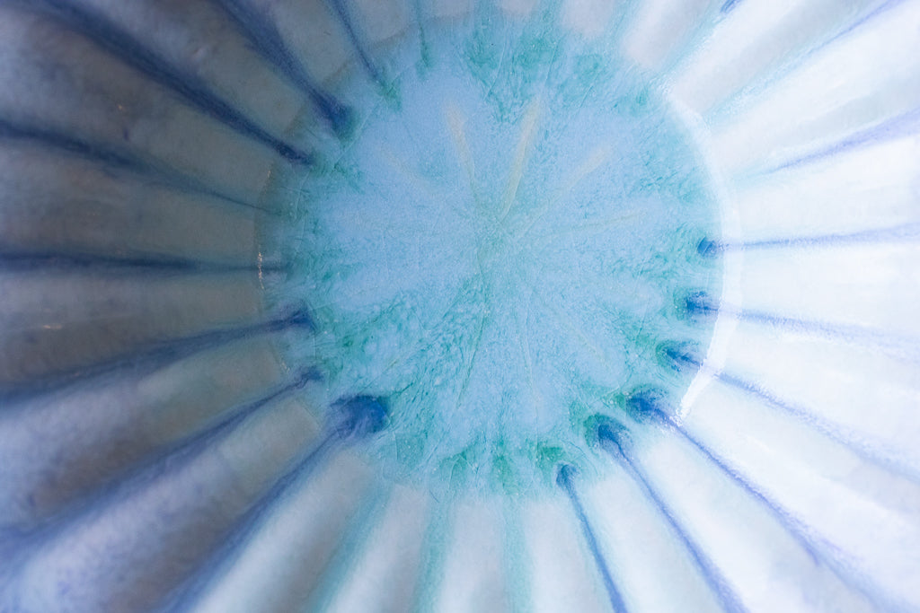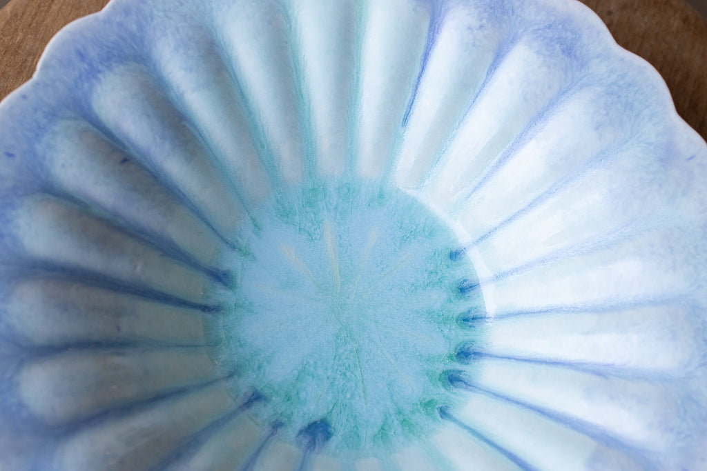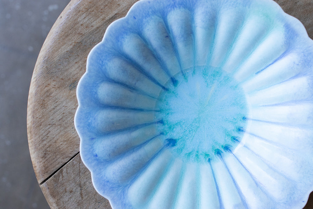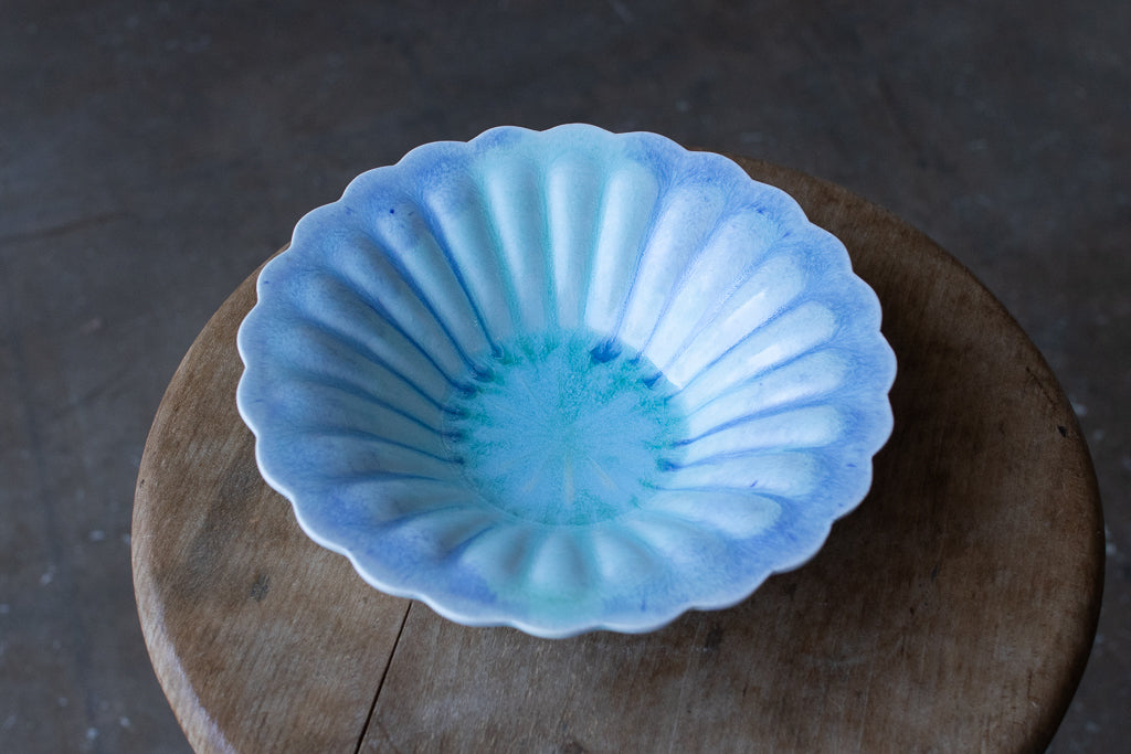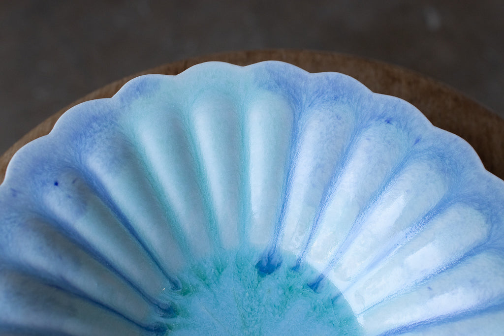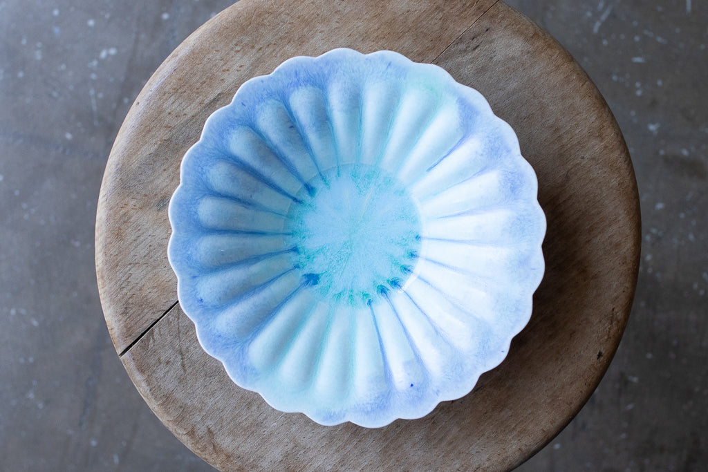 馬場さんの新作です!前回個展で初めて登場した型ものの新バリエーション。上品な輪花の鉢に馬場さんならではのテクスチャが載ったユニークな逸品です。釉の流れによってブルーからエメラルドグリーンまで、美しいグラデーションの表情を見せています。