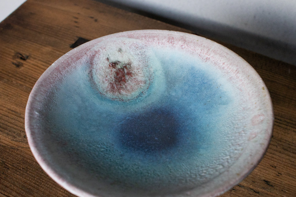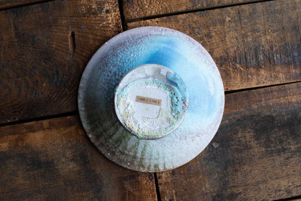 2020年頃から氏が取り組んでいるトルコブルー釉薬×薪窯焼成の作品。こちらは先日無事築窯された高橋さん自作の薪窯(トレインキルン)で焼成された作品です。初窯から何度か窯焚きをこなし、窯のレンガも焼きしまったりして、焼成結果もまだまだ読めないことが多いそうです。偶然と必然のあわいにあるような風合いをお楽しみ下さい。