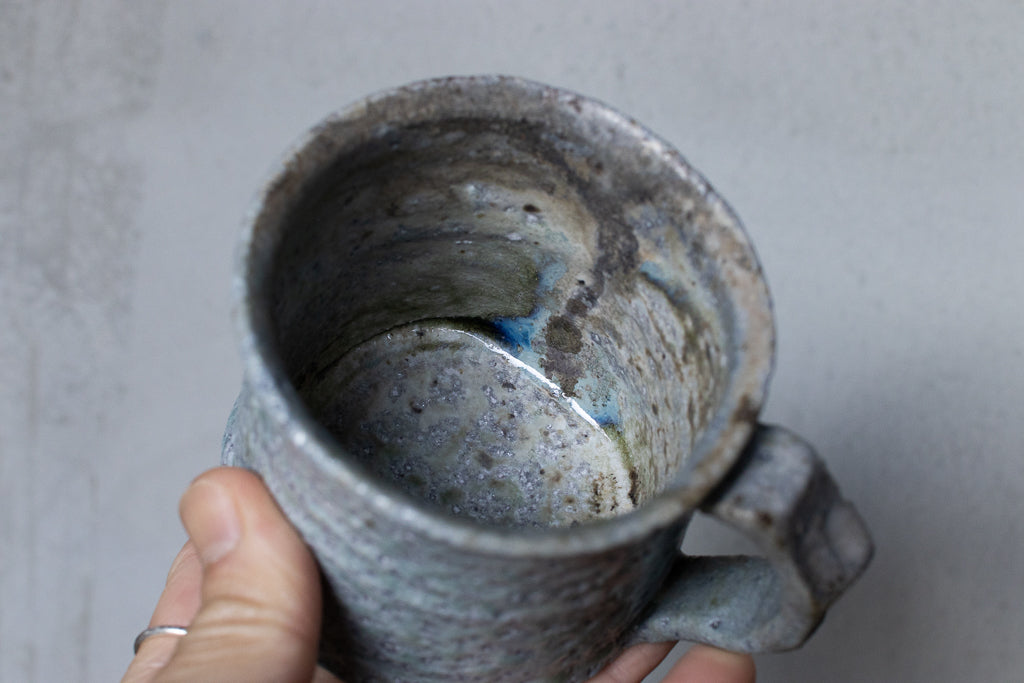 高橋燎氏の薪窯焼成のマグカップです。24年冬の個展出展作品です。全面を灰が熔けたアイスブルーの結晶に覆われた涼しげな作品。