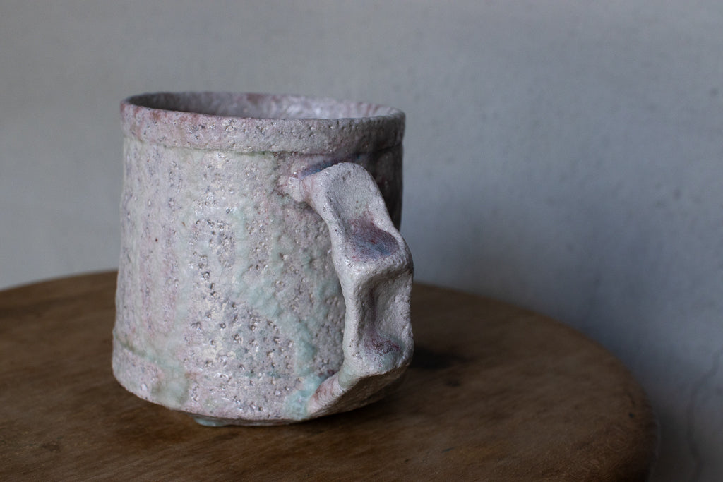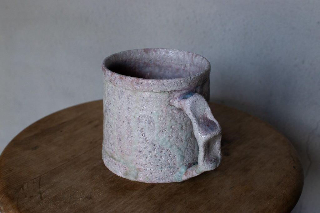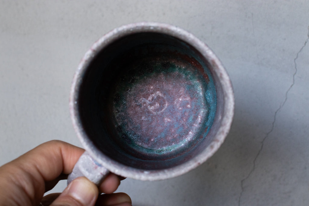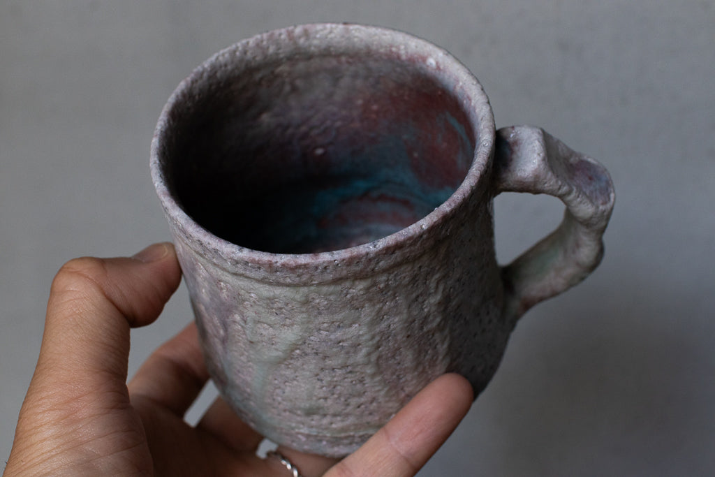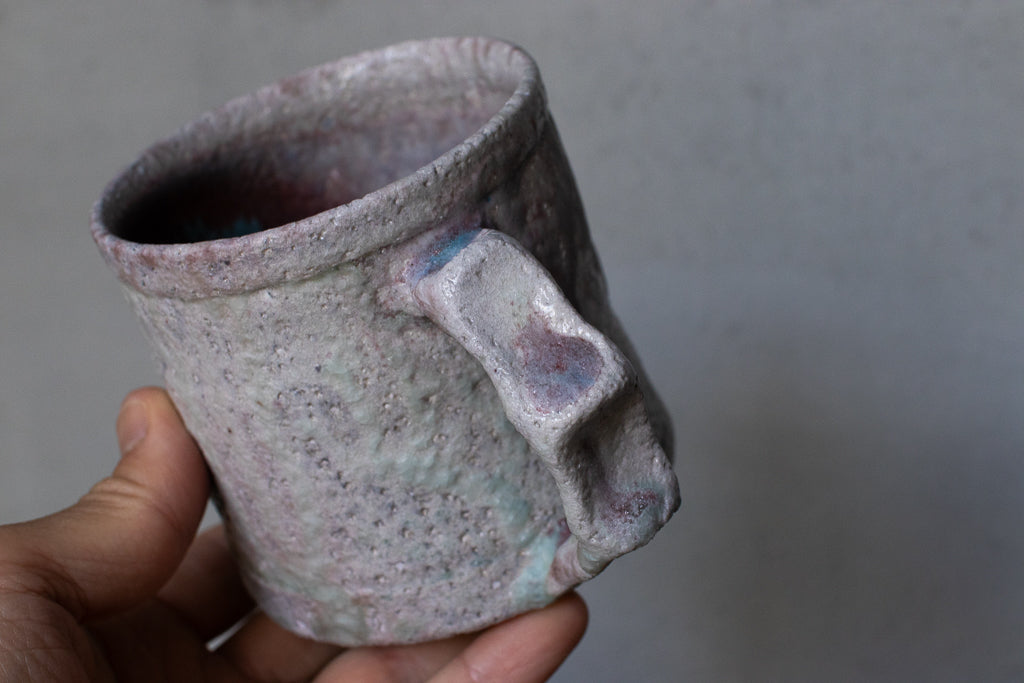高橋燎氏の薪窯焼成のマグカップです。25年7月の窯焚きによる新作です。灰が熔けたアイスブルーの結晶に覆われた涼しげな作品。一部側面には信楽焼らしい緋色、内側にはトルコブルー釉の青色も見てとれ、見どころの多い作品です。