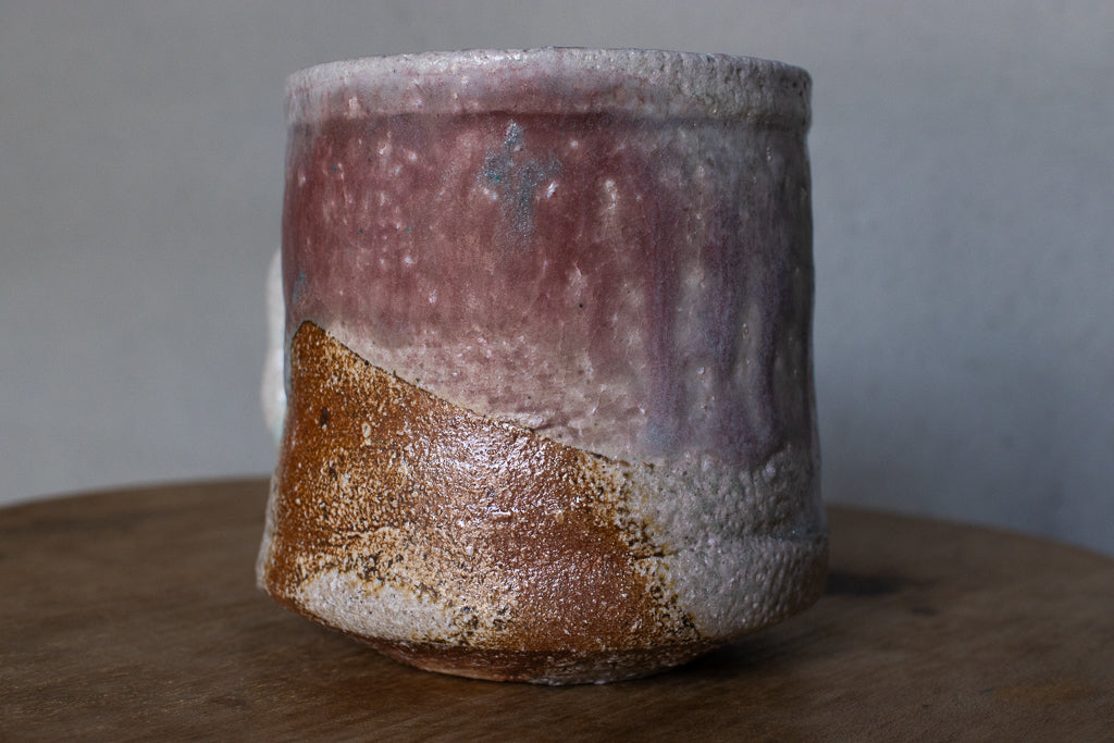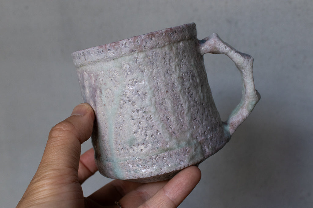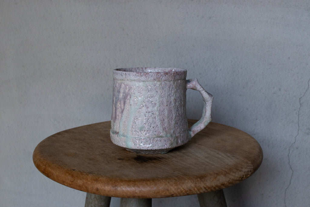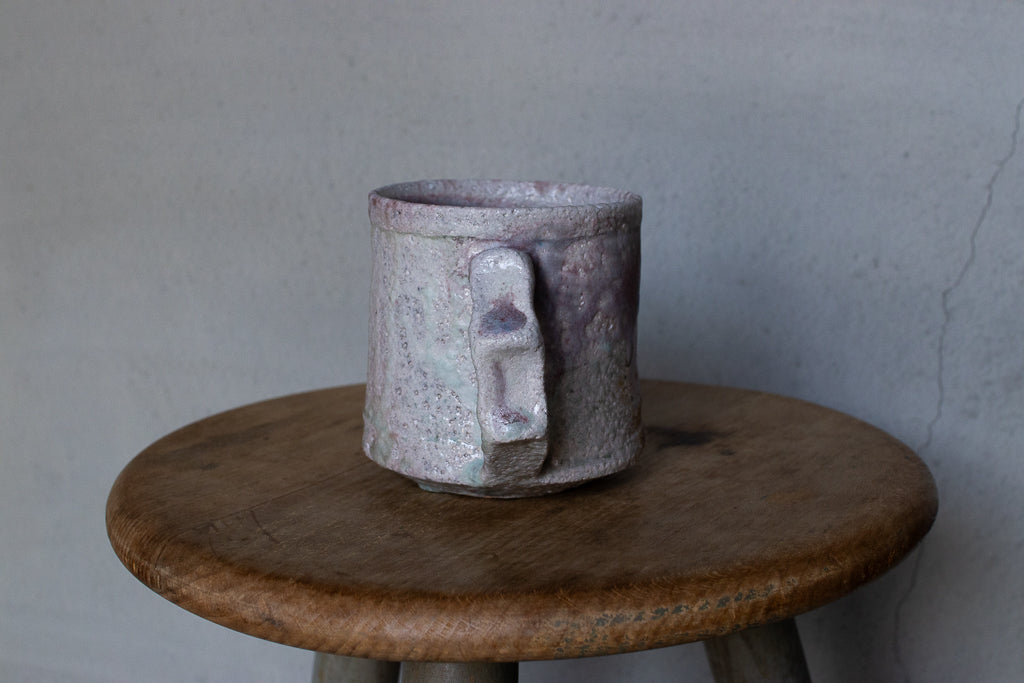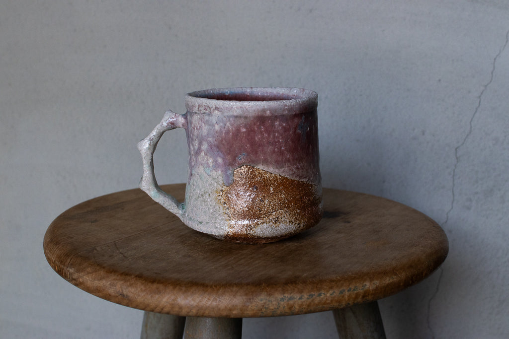 高橋燎氏の薪窯焼成のマグカップです。25年7月の窯焚きによる新作です。灰が熔けたアイスブルーの結晶に覆われた涼しげな作品。一部側面には信楽焼らしい緋色、内側にはトルコブルー釉の青色も見てとれ、見どころの多い作品です。