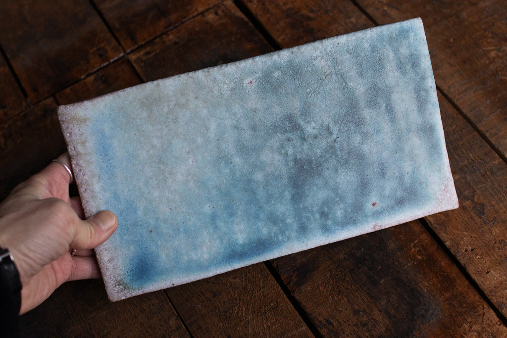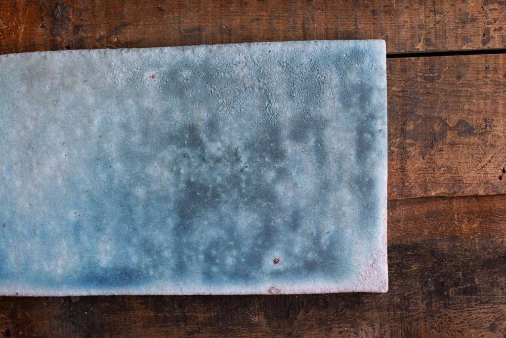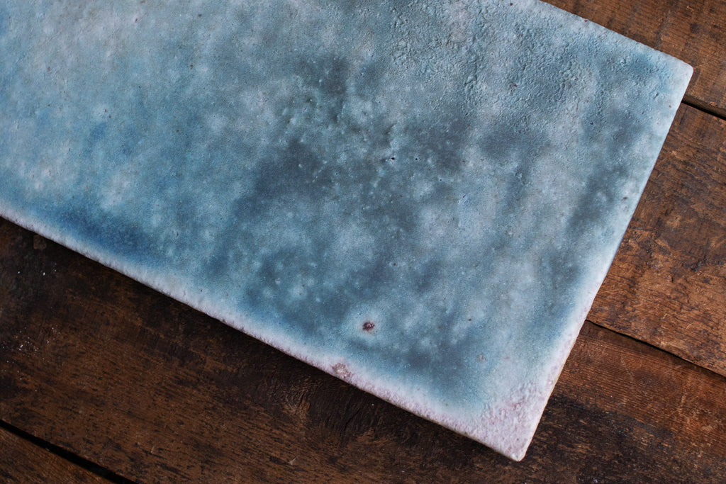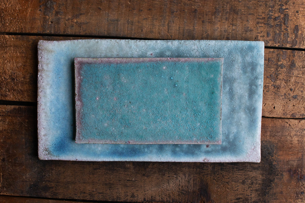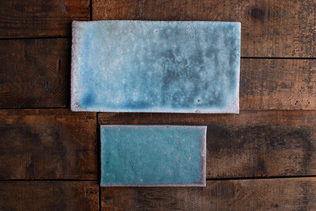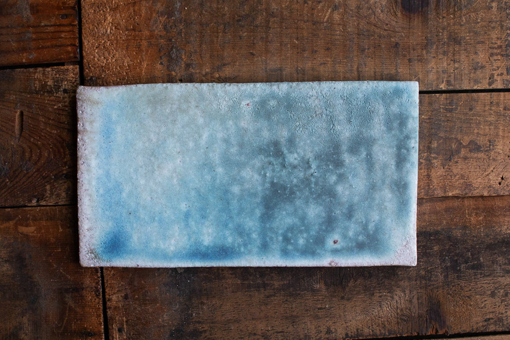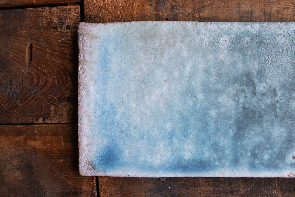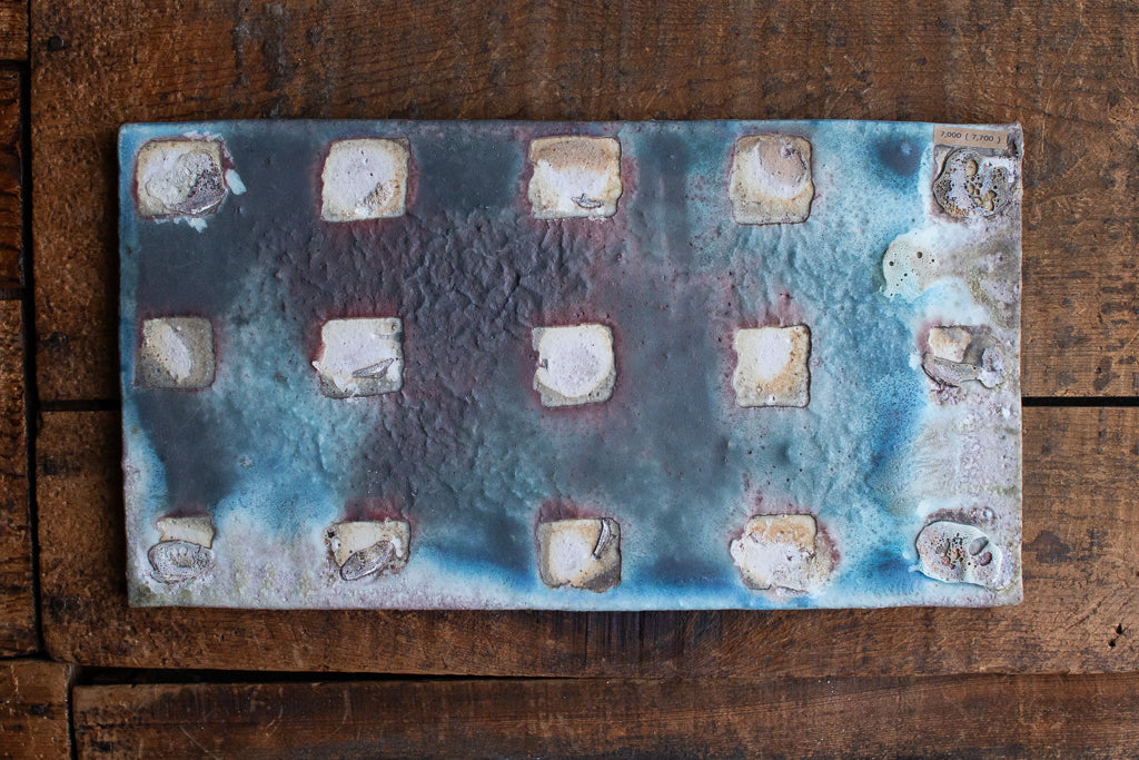 2020年頃から氏が取り組んでいるトルコブルー釉薬×薪窯焼成の作品。こちらは先日無事築窯された高橋さん自作の薪窯(トレインキルン)で焼成された作品です。初窯から何度か窯焚きをこなし、窯のレンガも焼きしまったりして、焼成結果もまだまだ読めないことが多いそうです。偶然と必然のあわいにあるような風合いをお楽しみ下さい。