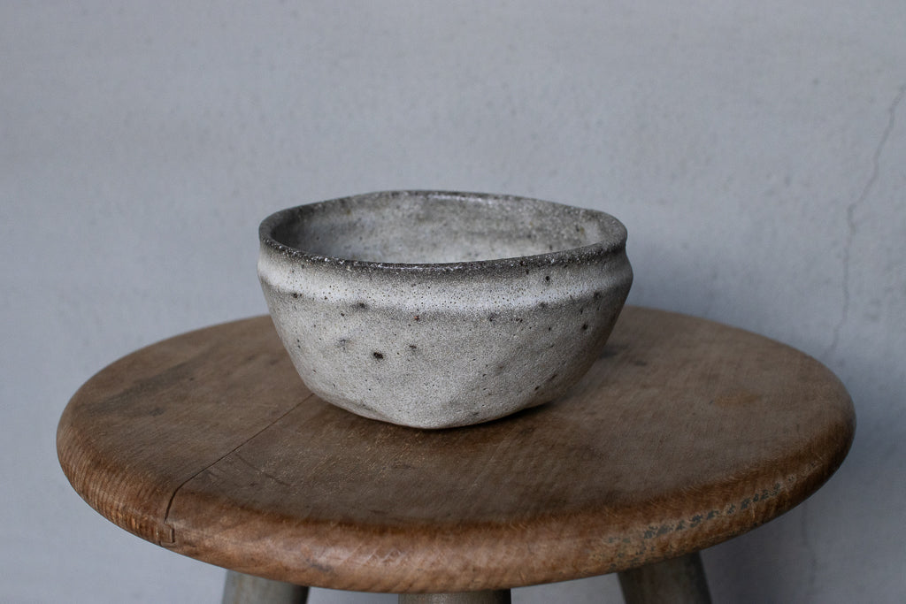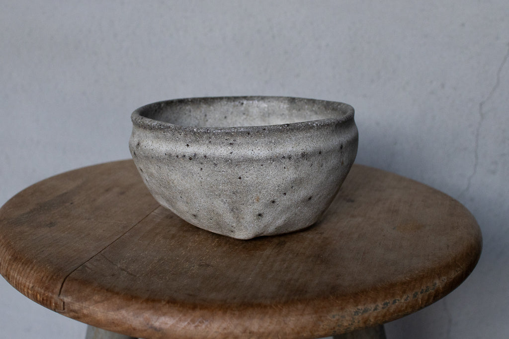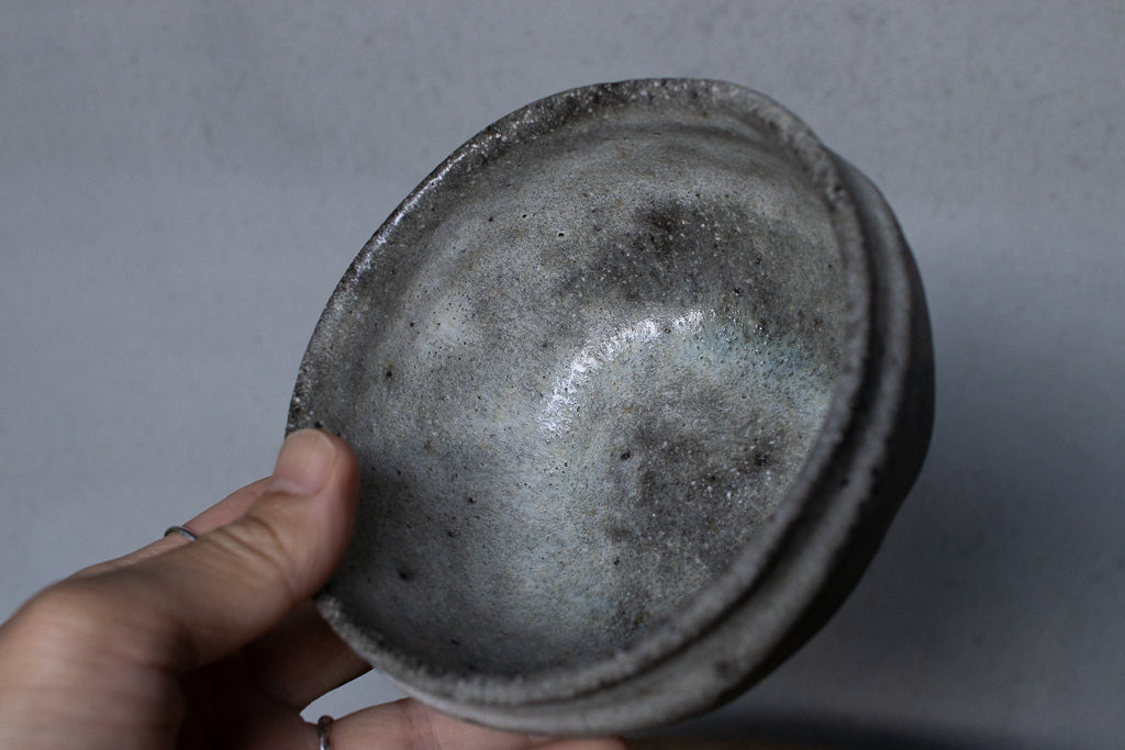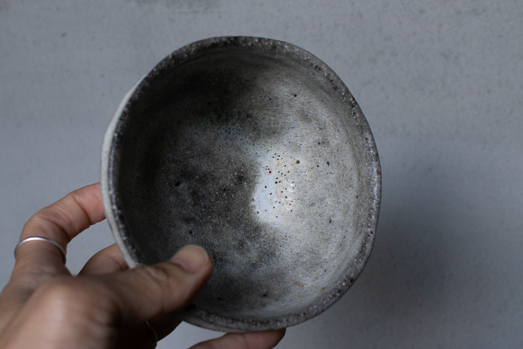 笠間の陶芸家 鷲沢ワシ子氏の碗/小鉢です。ワシ子さんが最近取り組んでいる新技法による作品。器下部はお得意のくり抜き技法でやや直線的に造形し、独特の石のような佇まいを表現。そして口縁のみをろくろで挽いて口当たりよく仕上げています。お料理の盛り付けはもちろん、たっぷりとカフェオレボウルのような使い方でも愛用頂けそうです。ツヤのある見込みに三つ足の高台もキュート。