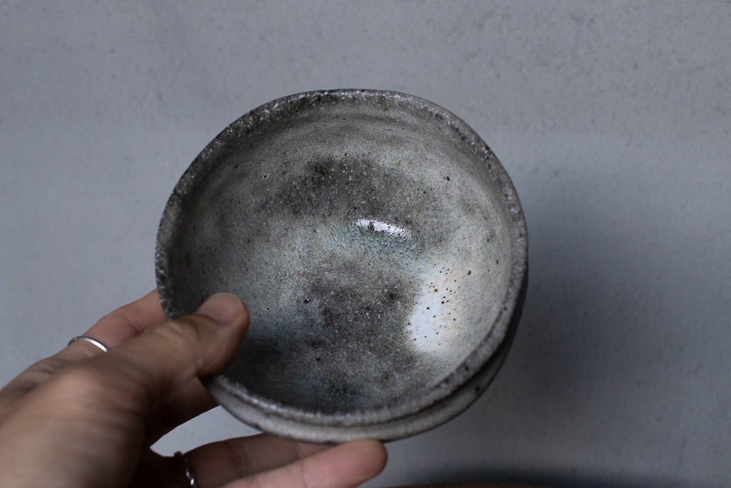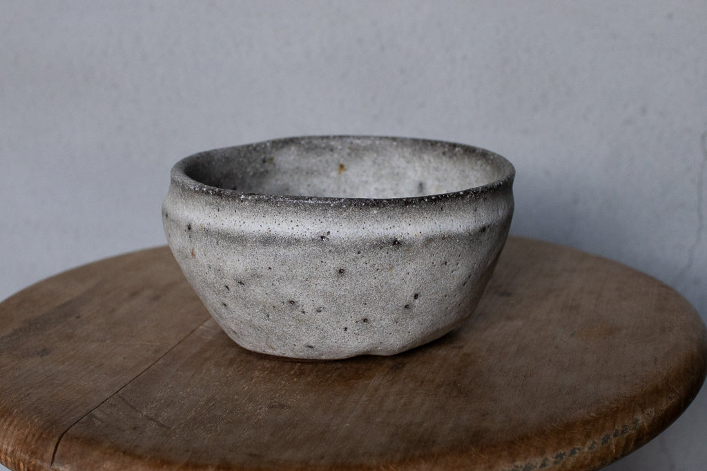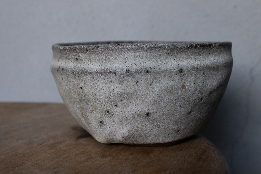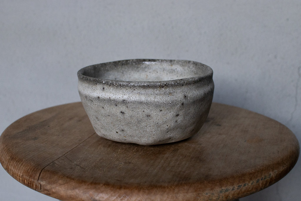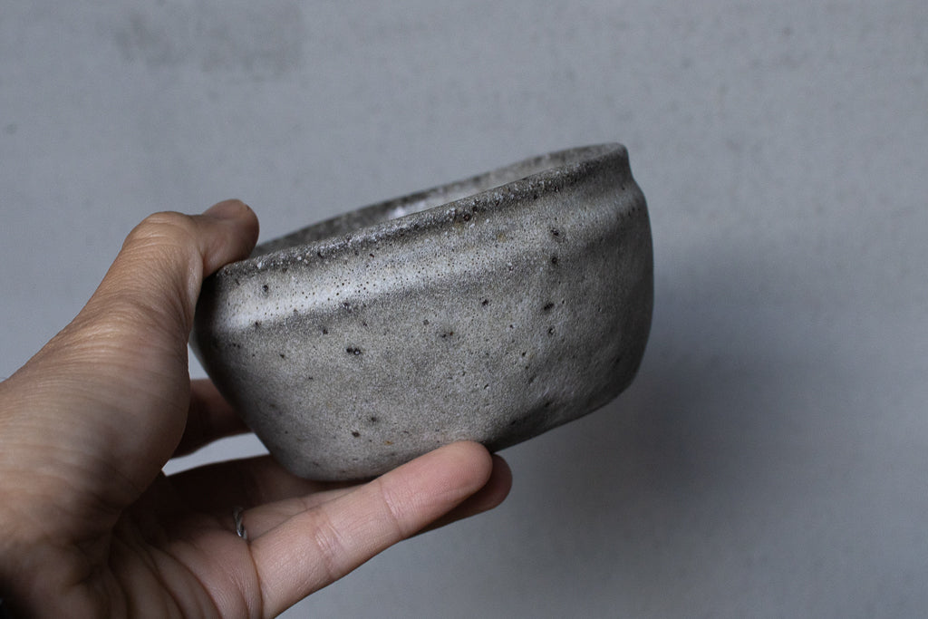 笠間の陶芸家 鷲沢ワシ子氏の碗/小鉢です。ワシ子さんが最近取り組んでいる新技法による作品。器下部はお得意のくり抜き技法でやや直線的に造形し、独特の石のような佇まいを表現。そして口縁のみをろくろで挽いて口当たりよく仕上げています。お料理の盛り付けはもちろん、たっぷりとカフェオレボウルのような使い方でも愛用頂けそうです。ツヤのある見込みに三つ足の高台もキュート。