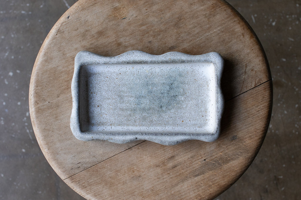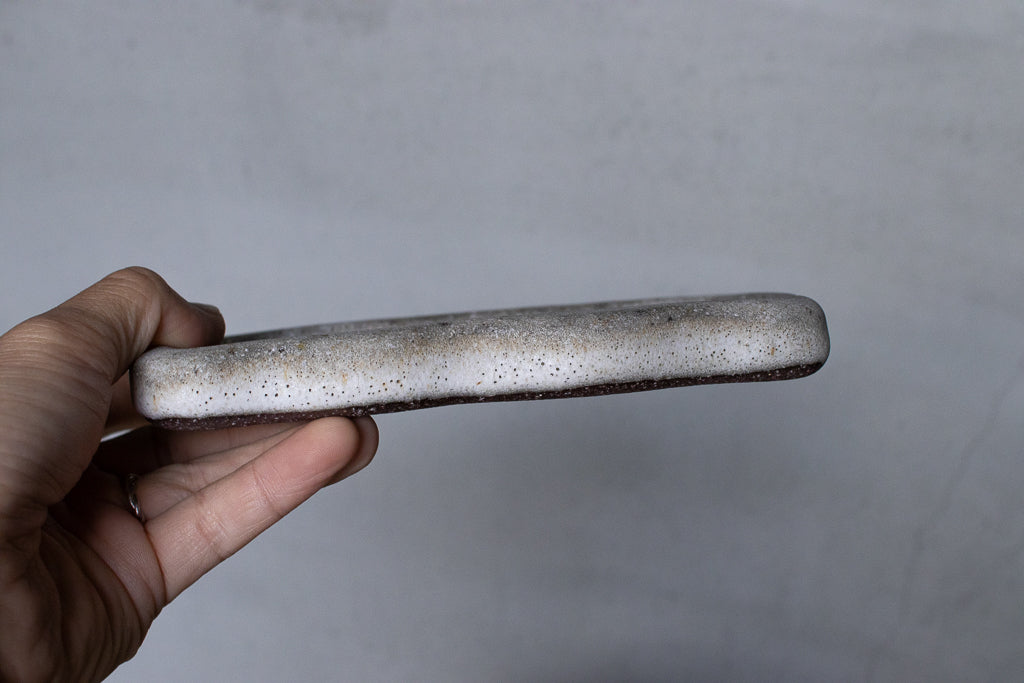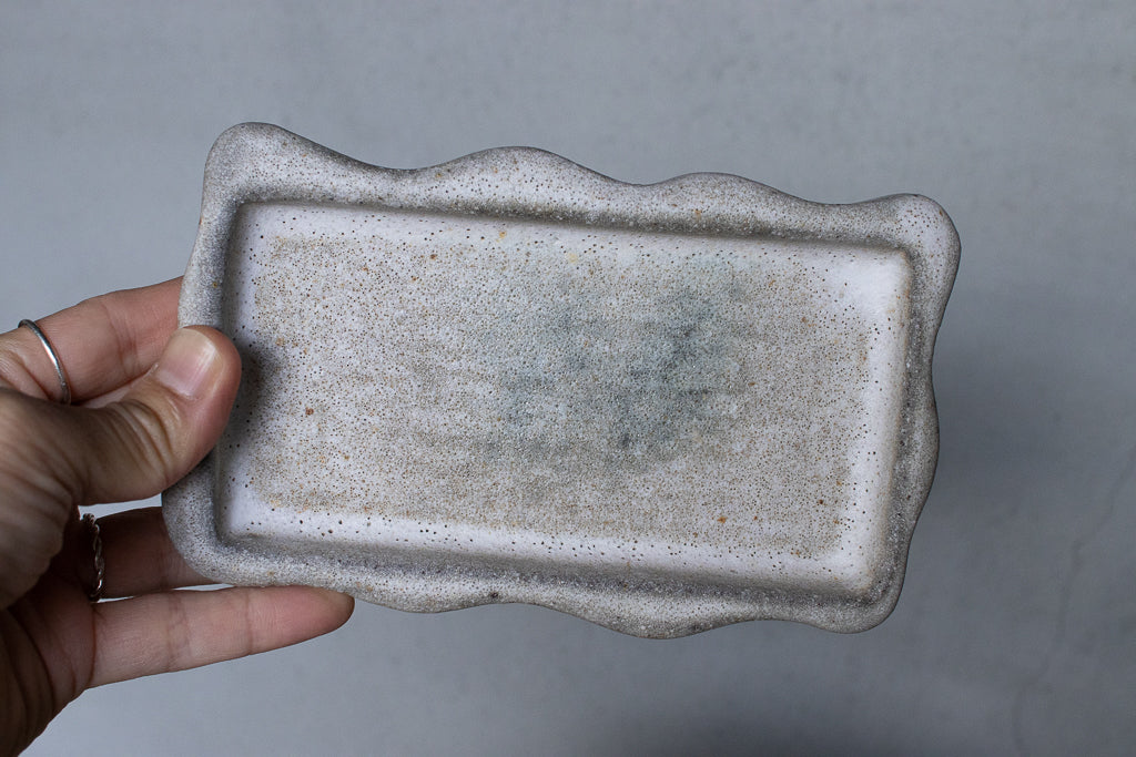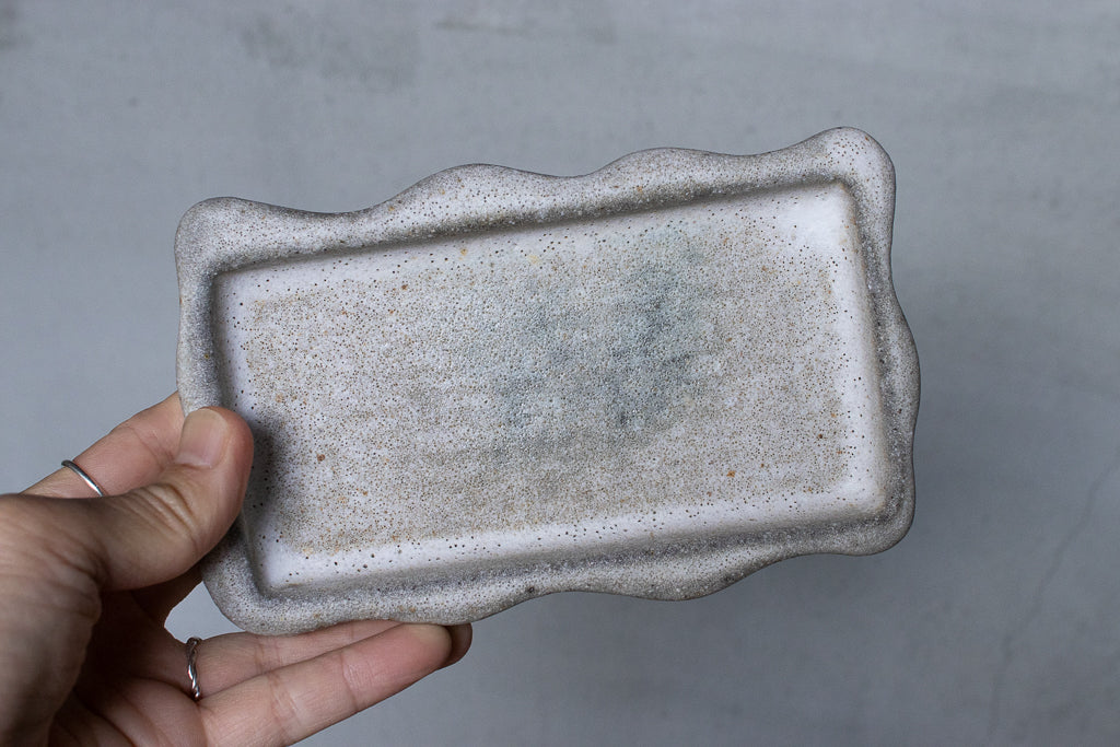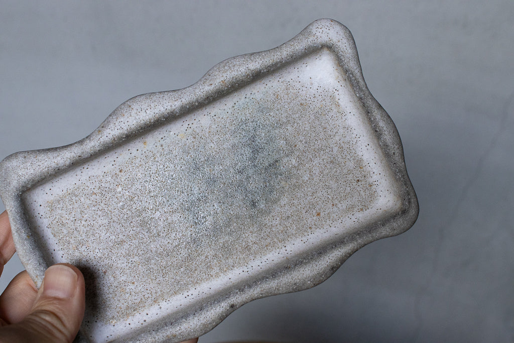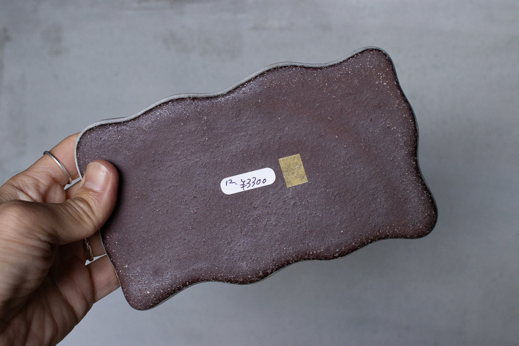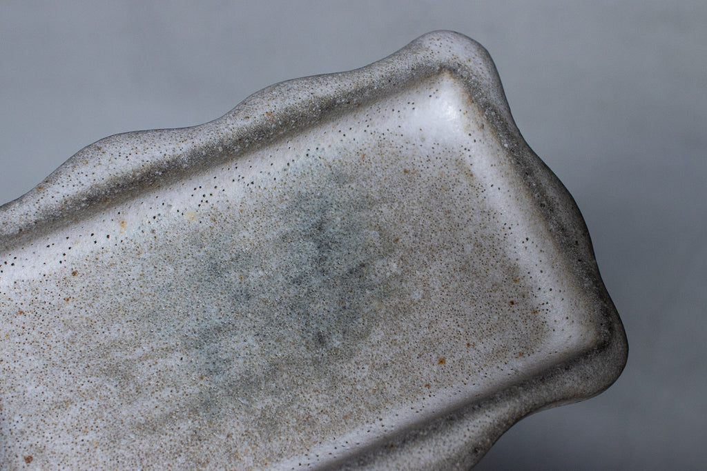 笠間の陶芸家 鷲沢ワシ子氏のこぶりな長皿です。石のような独特なテクスチャの作風が大変魅力的です。小料理を盛り付ける他、アクセサリートレイや小物置きとしても活躍してくれそうです。
