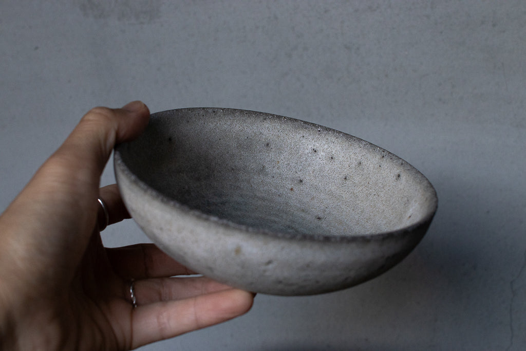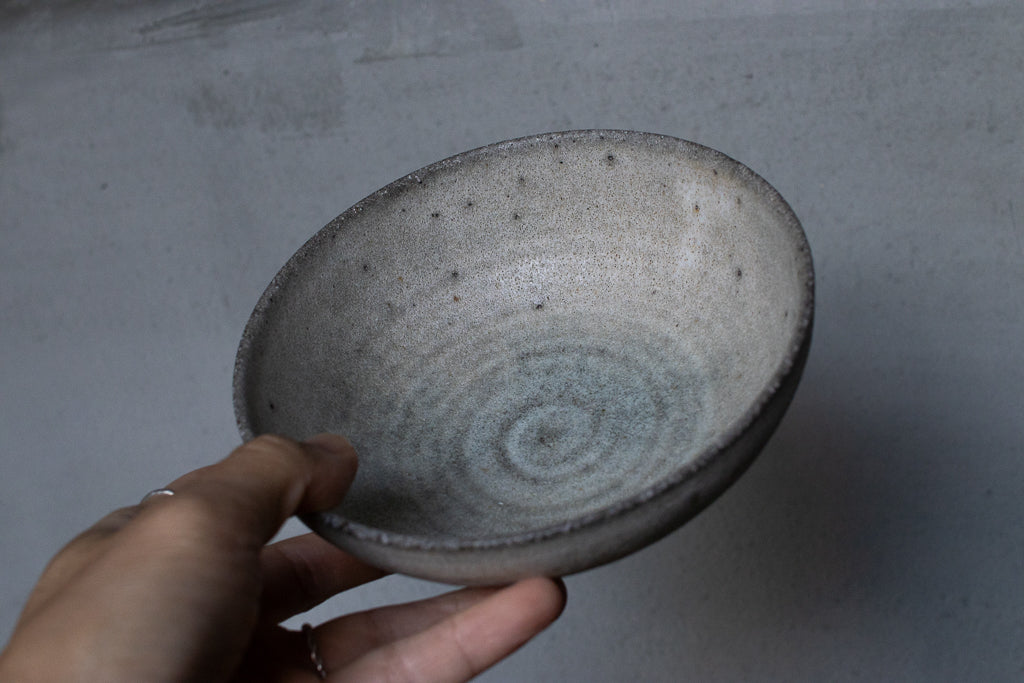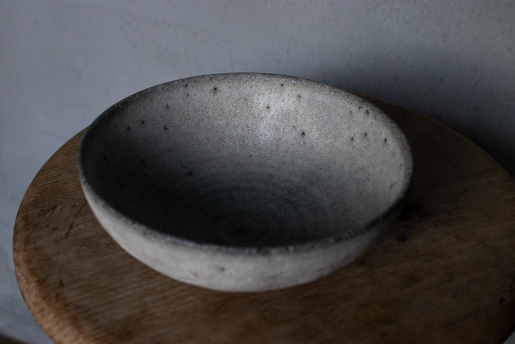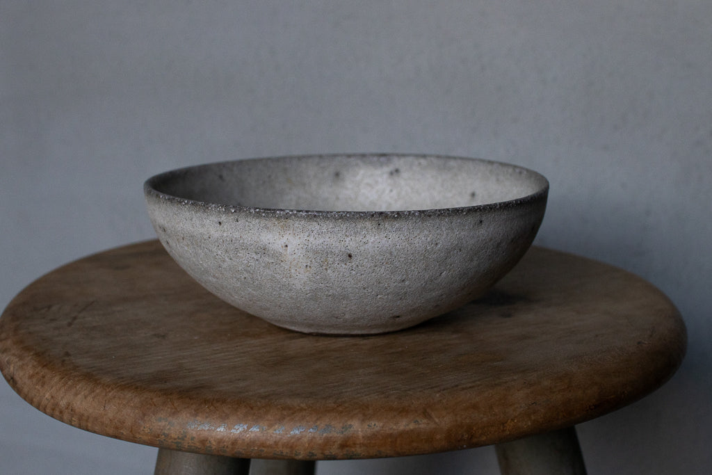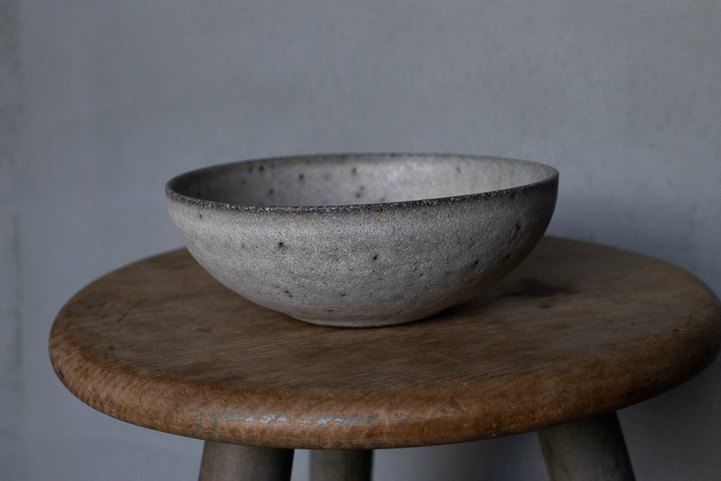 笠間の陶芸家 鷲沢ワシ子氏の中鉢です。ろくろで挽いたベーシックな造形に独特な石のような質感。見込みのツヤも素敵です。