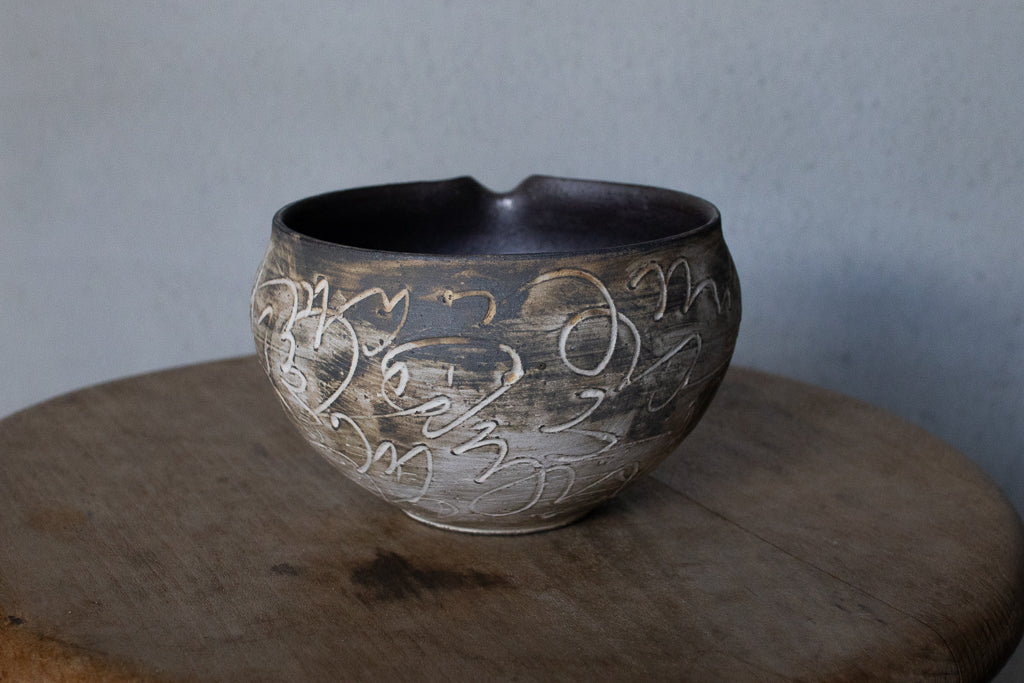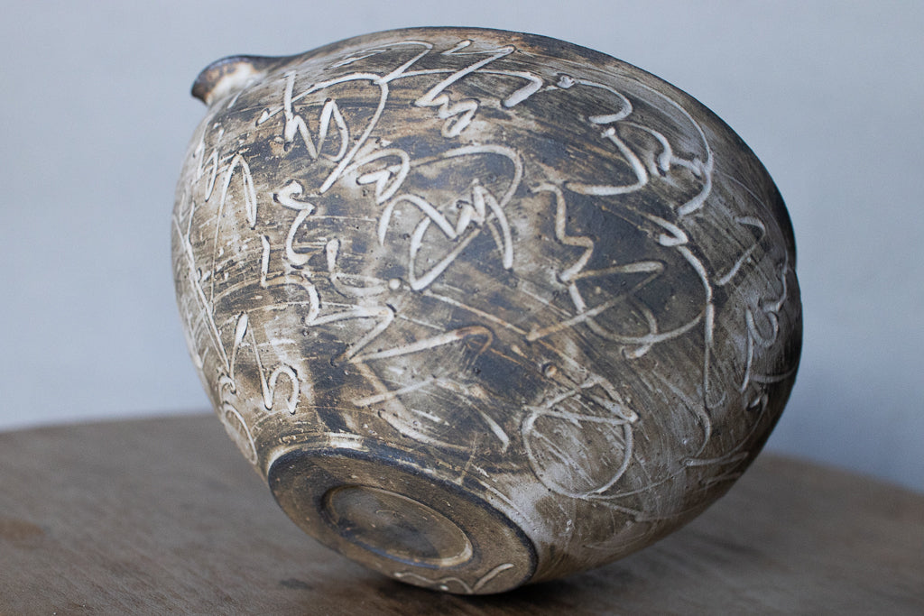 枯色線紋と名付けられた独特の枯れた質感に、フリーハンドで施されたリズミカルな線紋が軽やかに踊ります。線紋は針のような陶芸道具で引っかいて描いた後にベースとは異なる泥を埋めた一種の象嵌のような技法で表現されています。完全に埋まりきってはおらず、カサカサして凸凹感のある手触りがとても楽しく、撫でさすりたくなる作品です。表面は泥化粧+焼締めの仕上げですが、内側はダークでメタリックな釉薬が流してあり染み込みもなく日常的に便利にお使い頂けます。内外の色のコントラストも素敵です。