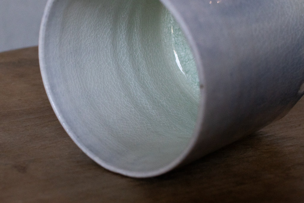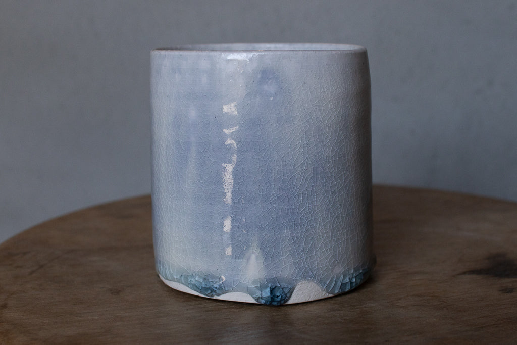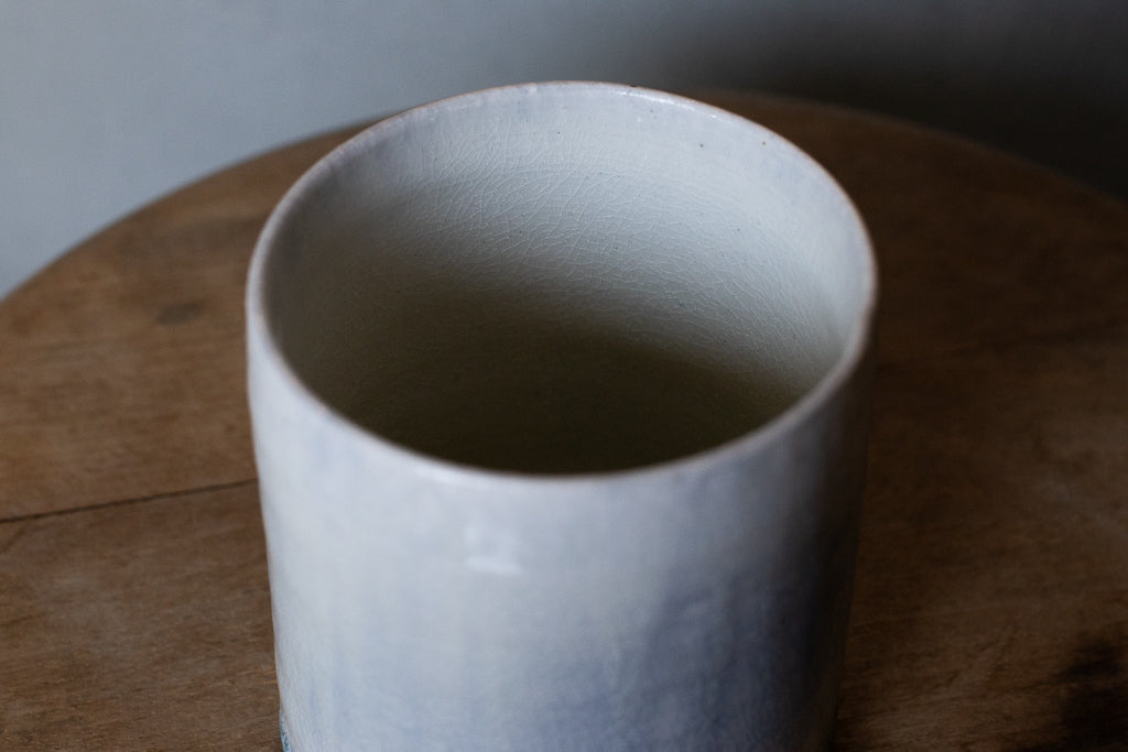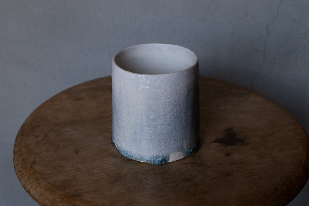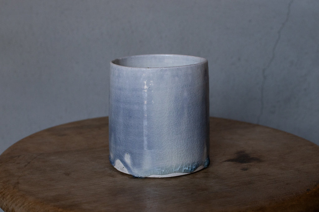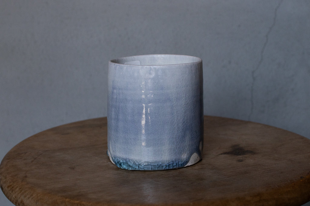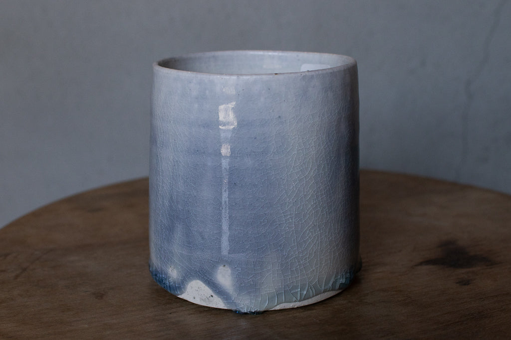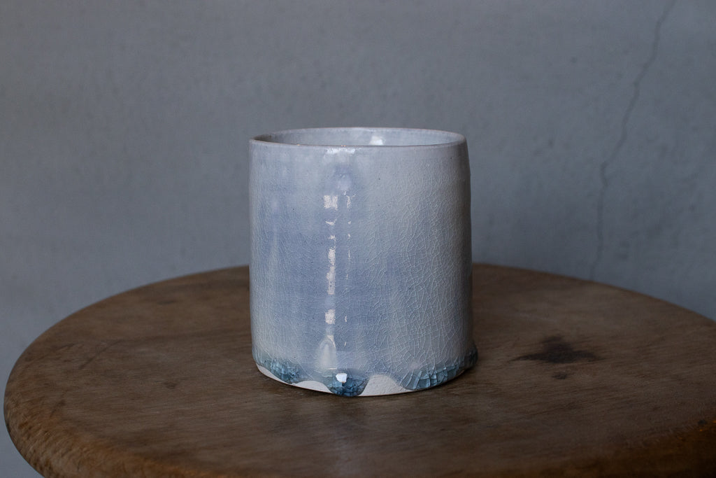 24年夏の個展出展作品。市川さんの代名詞の"流彩釉"。筒型のシンプルな湯呑み/フリーカップです。側面の釉の流れ、見込みの溜まりが美しい。自ら調合した土と土灰を使った作品です。