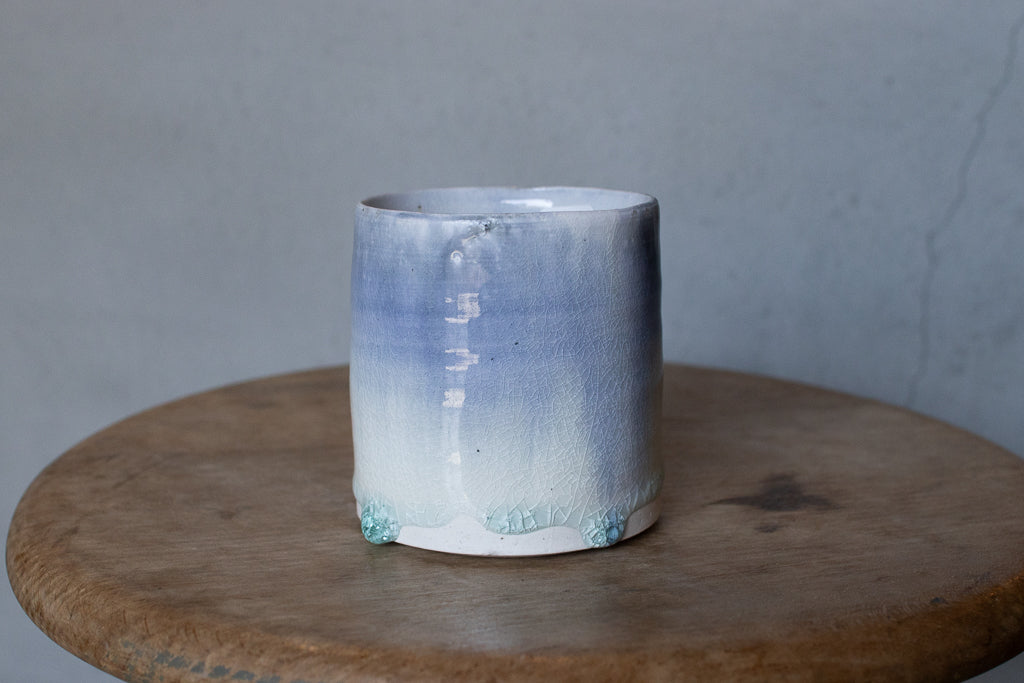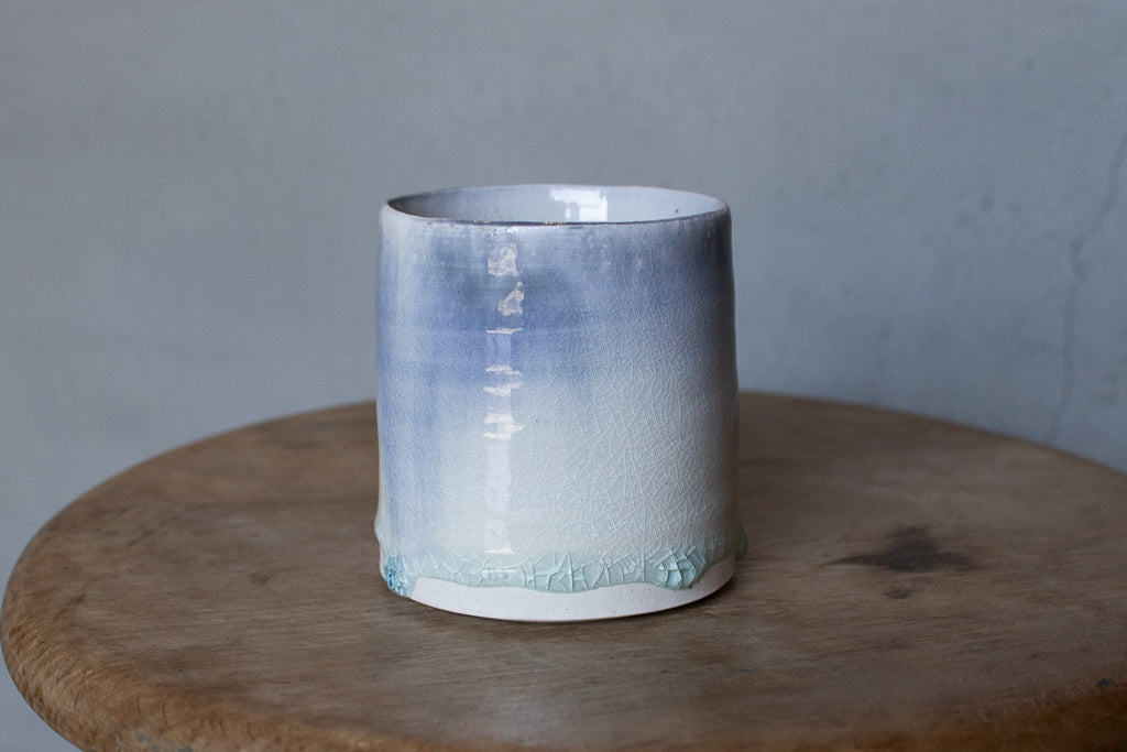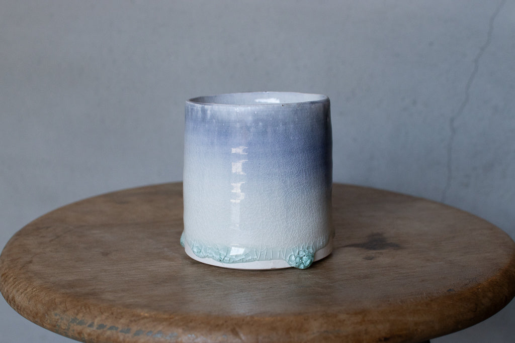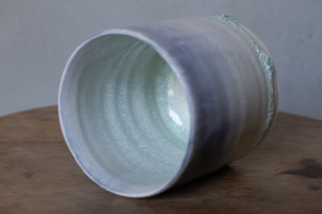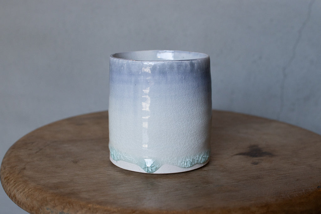 24年夏の個展出展作品。市川さんの代名詞の"流彩釉"。筒型のシンプルな湯呑み/フリーカップです。側面の釉の流れ、見込みの溜まりが美しい。自ら調合した白土と土灰を使った作品です。