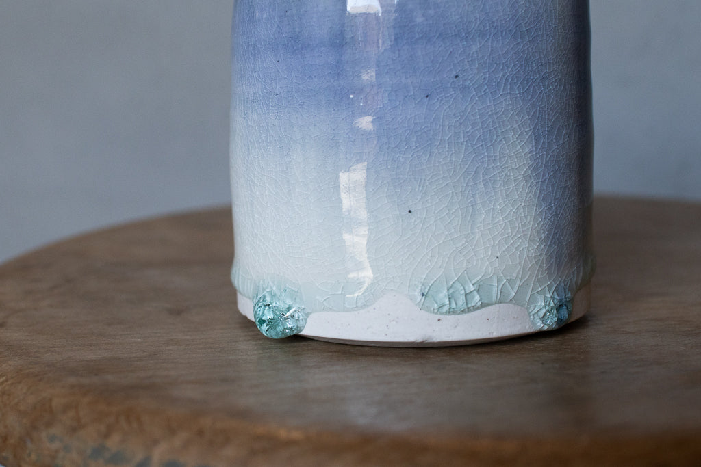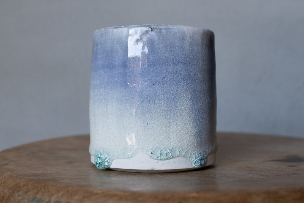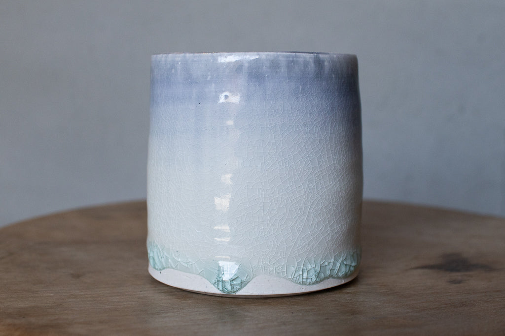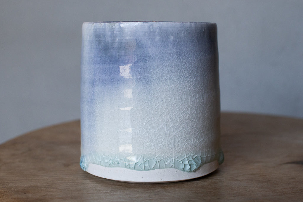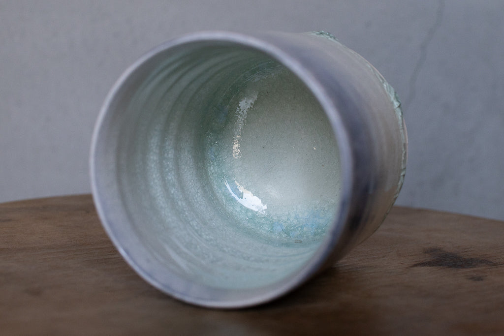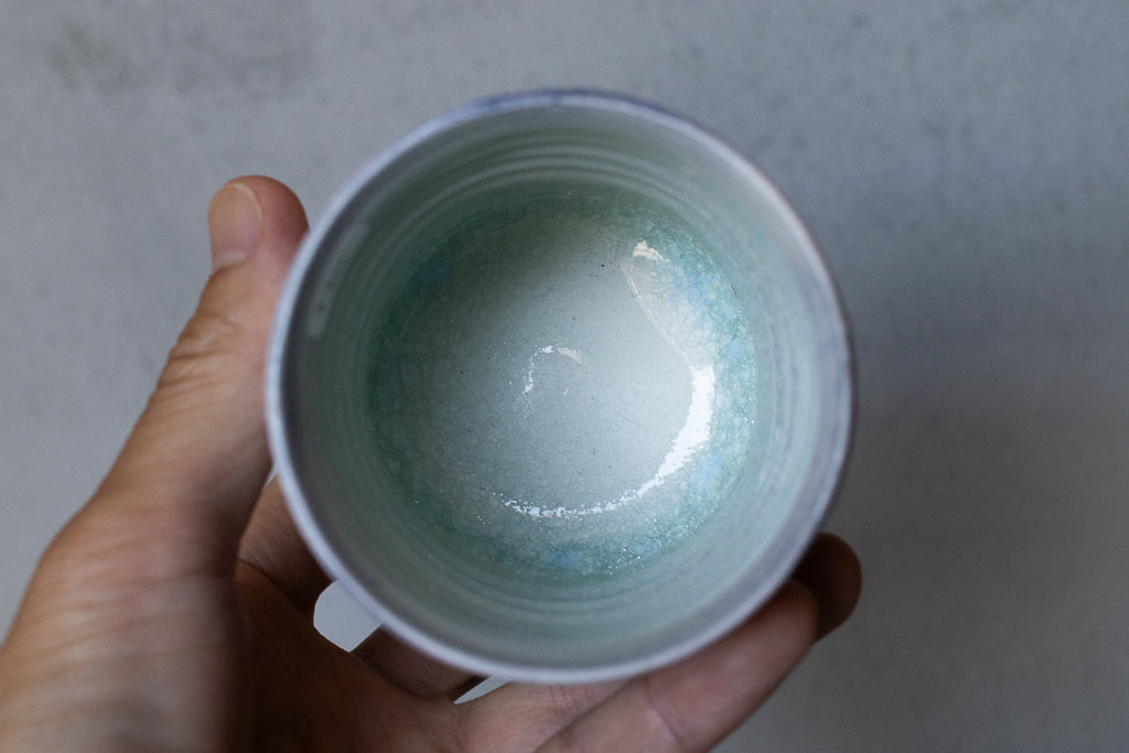 24年夏の個展出展作品。市川さんの代名詞の"流彩釉"。筒型のシンプルな湯呑み/フリーカップです。側面の釉の流れ、見込みの溜まりが美しい。自ら調合した白土と土灰を使った作品です。