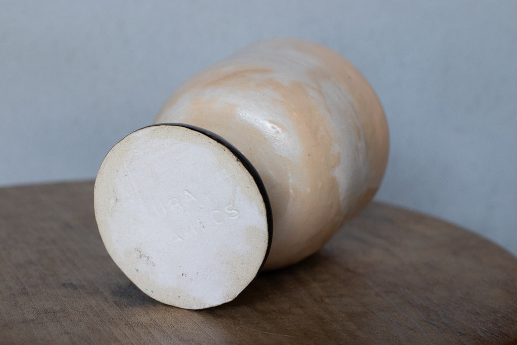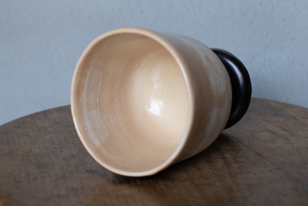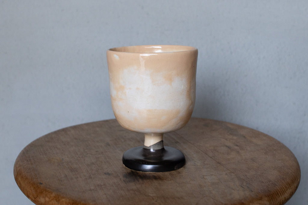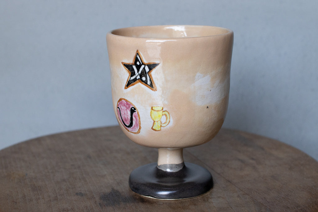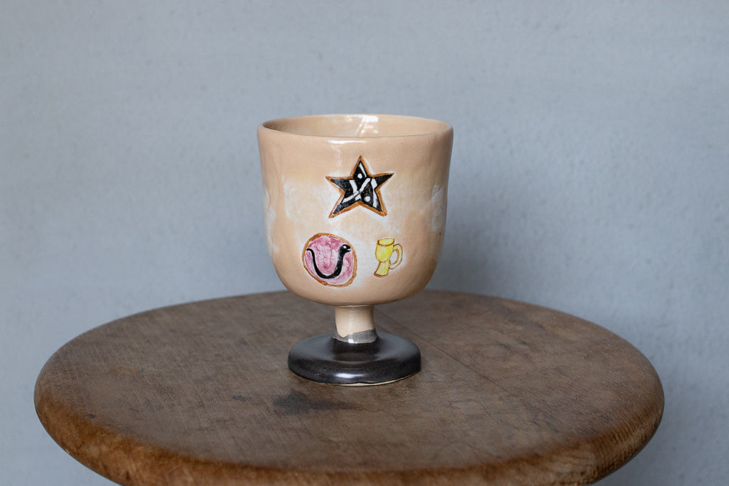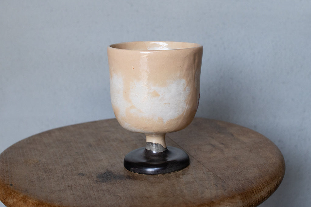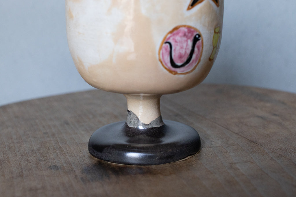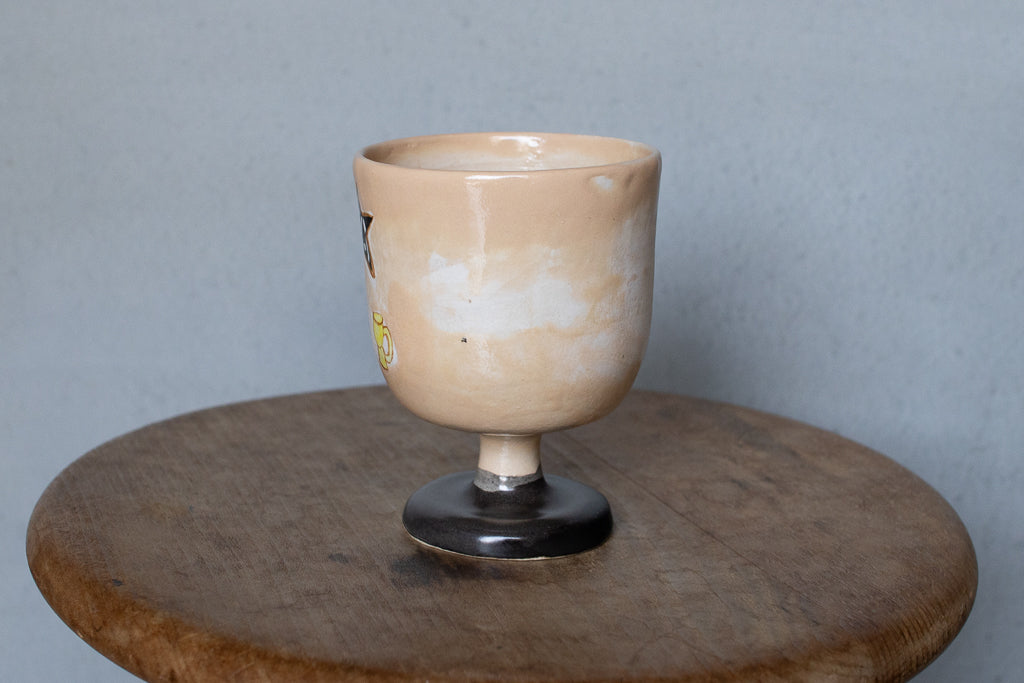 しっかり目の容量が確保されたゴブレット。キュートな絵付けが施された一点ものです。ベージュ地のむら感もカワイイ。