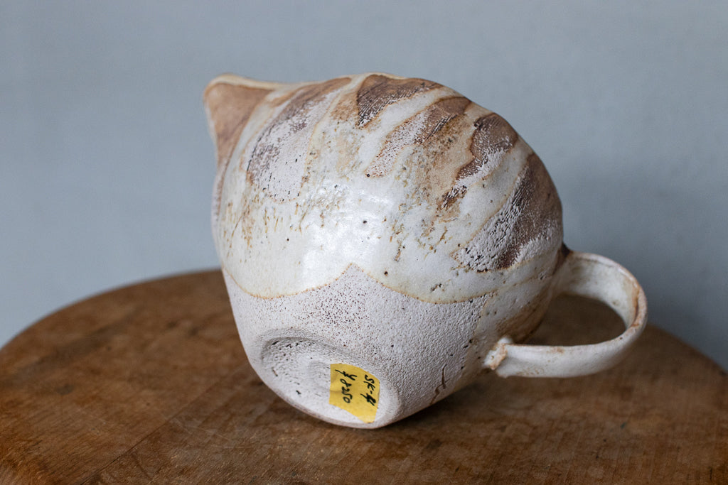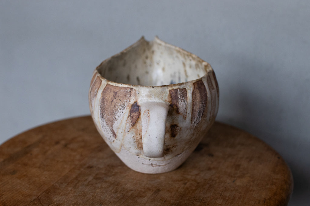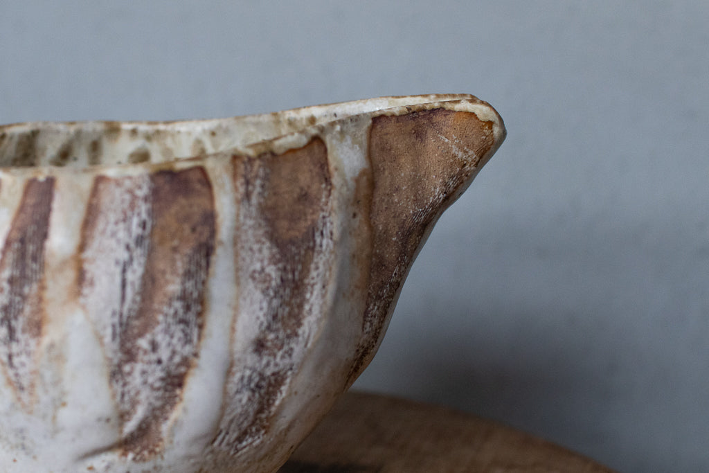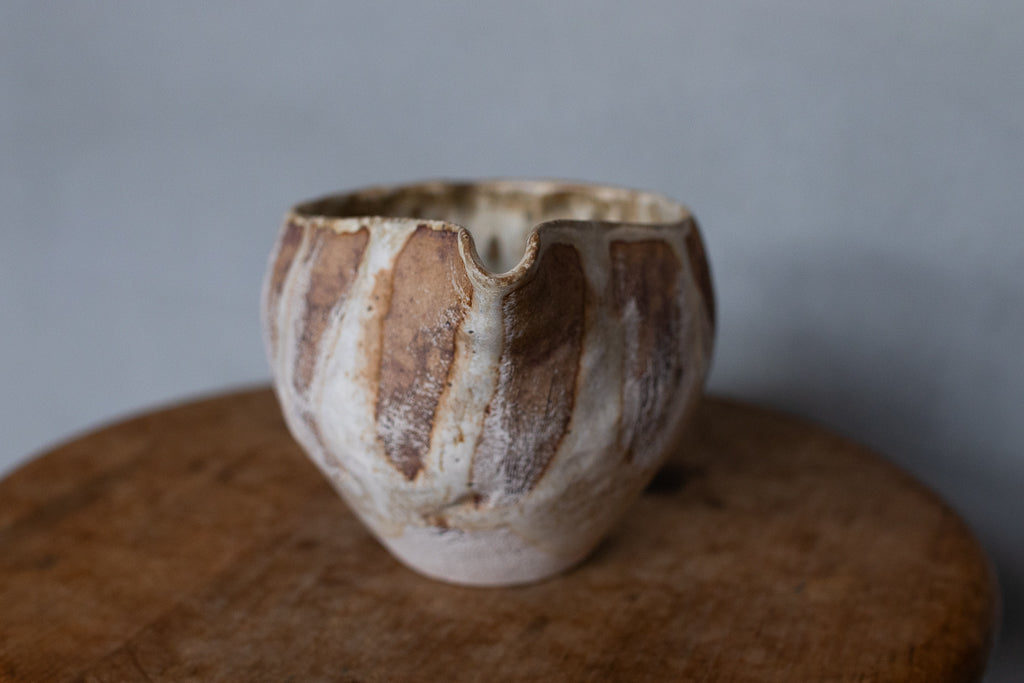 手びねりで形づくられたいびつさと柔らかさを感じさせる造形。内側はよく流れた釉薬の動きと釉溜まりの結晶が綺麗です。しかし何より素晴らしいのは外側の手触りです。滑りの良い白化粧の部分と工芸用のノコで加工したざらつきのある部分があり、独特の触り心地がクセになります。