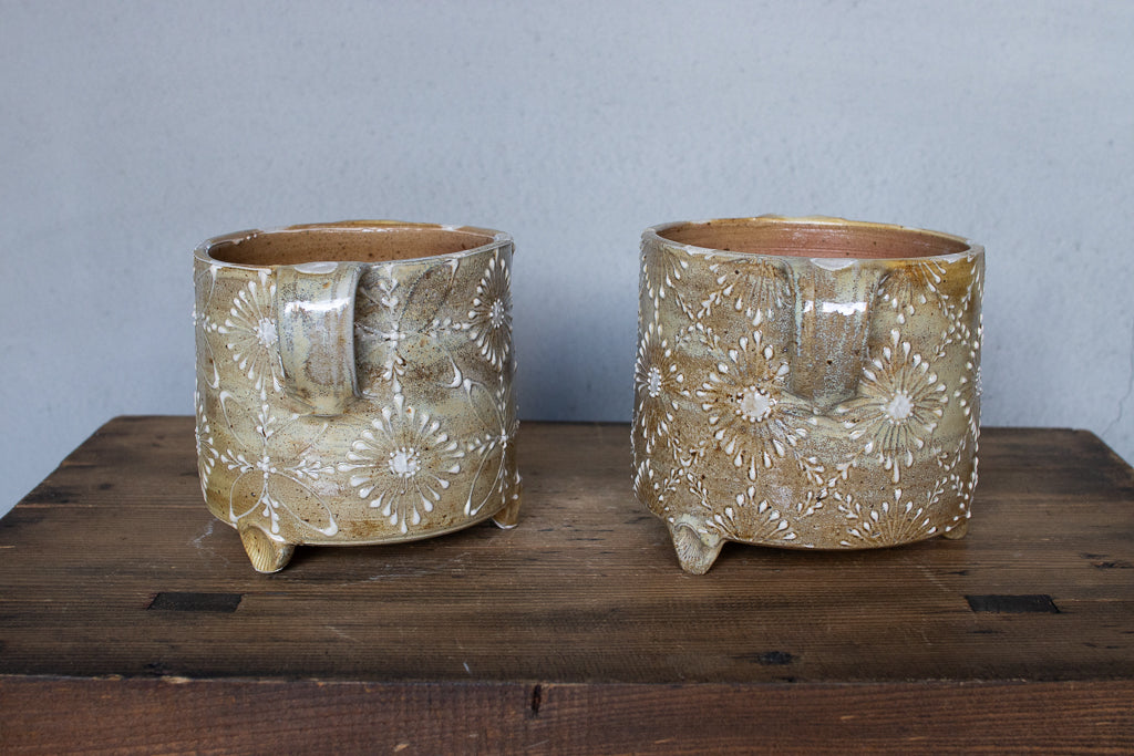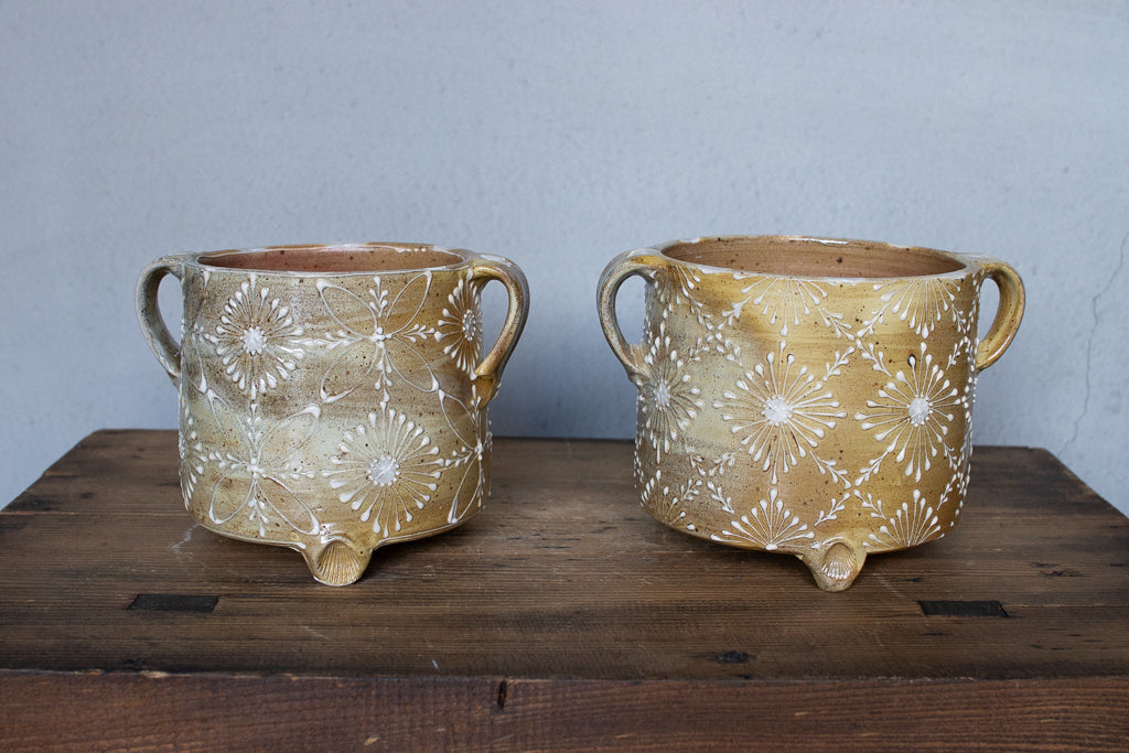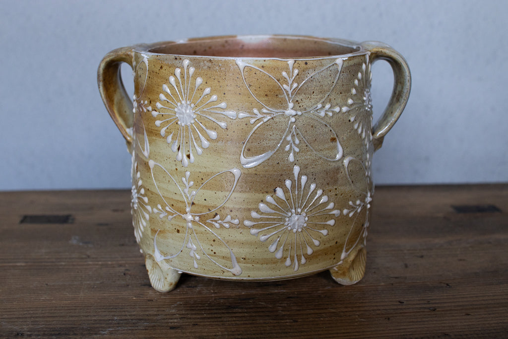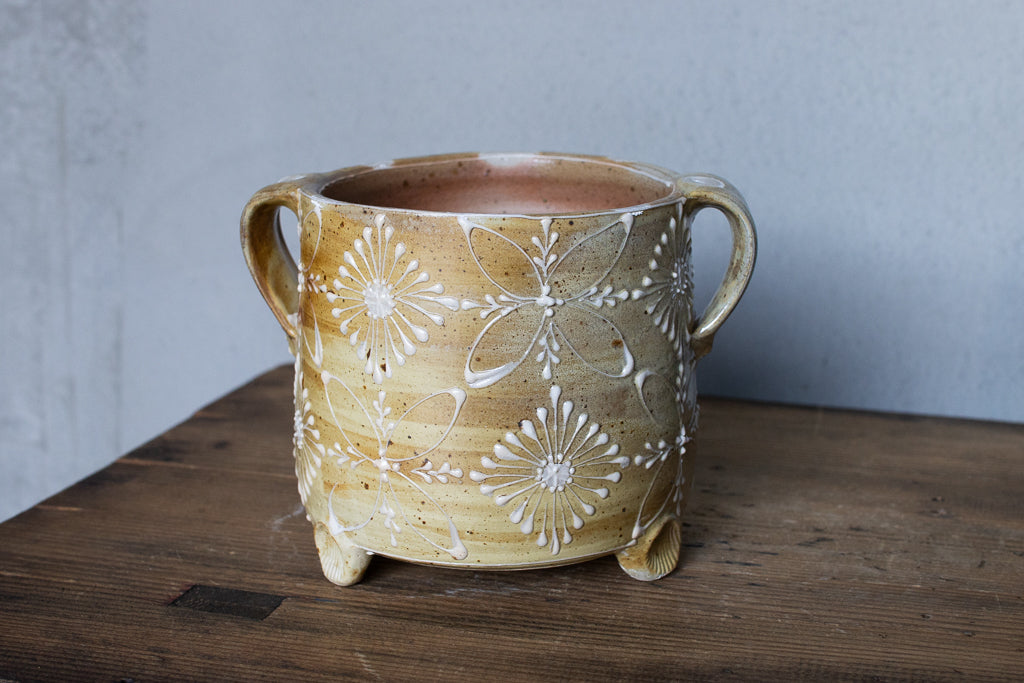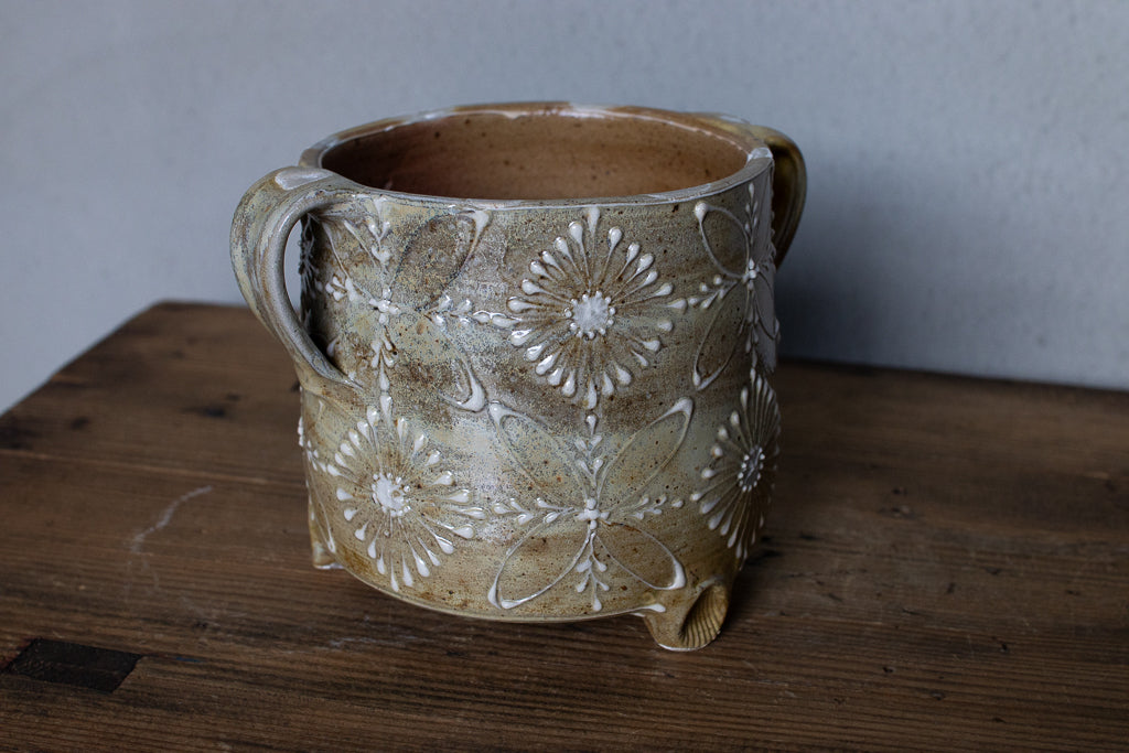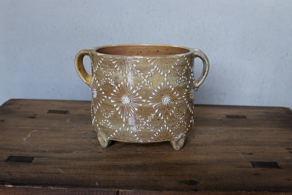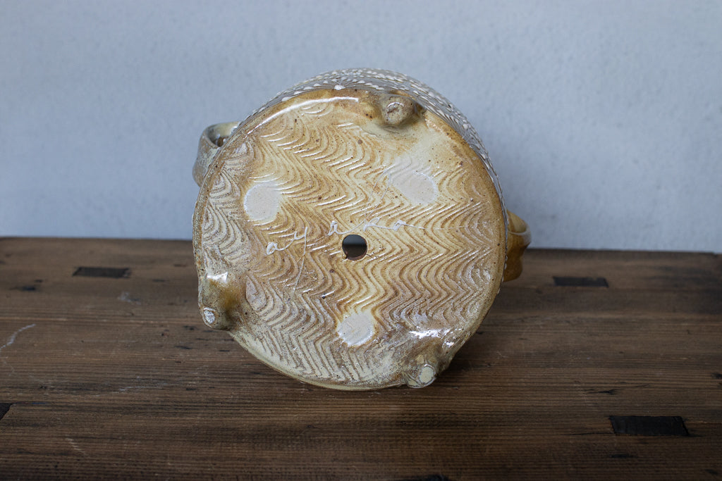 ayakaさんの土ものの植木鉢です。繊細なイッチンの柄と渋い質感が最高です。底穴はひとつ空いていますが鉢カバーとしても。