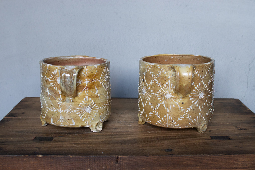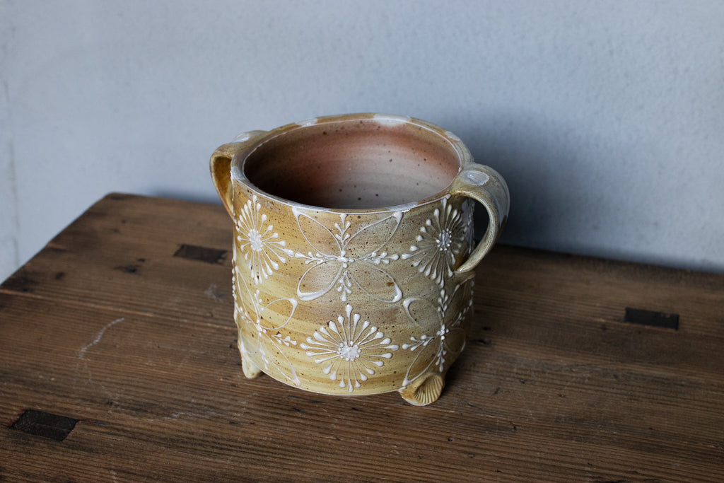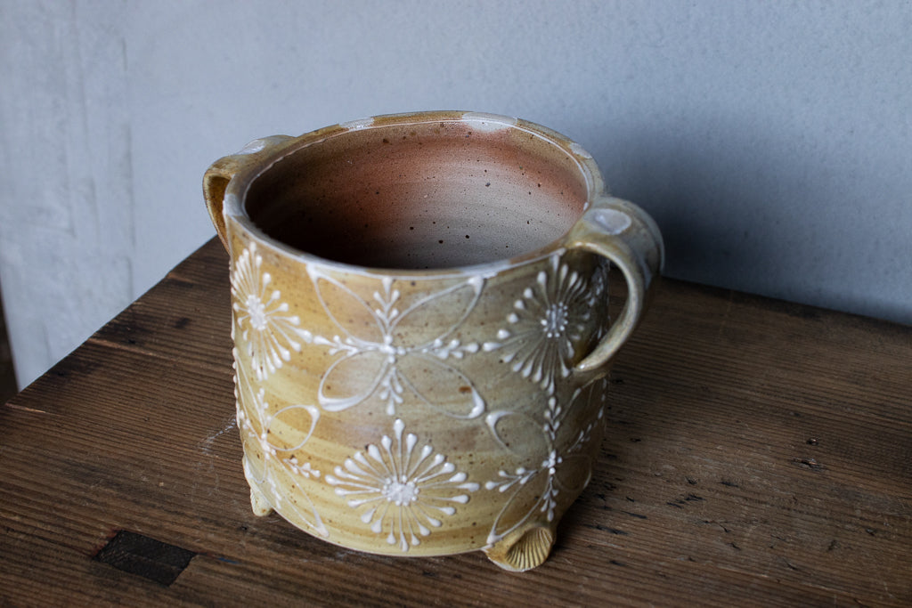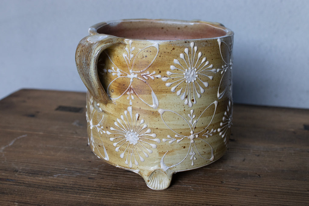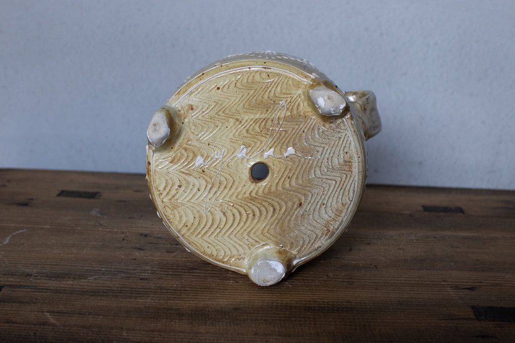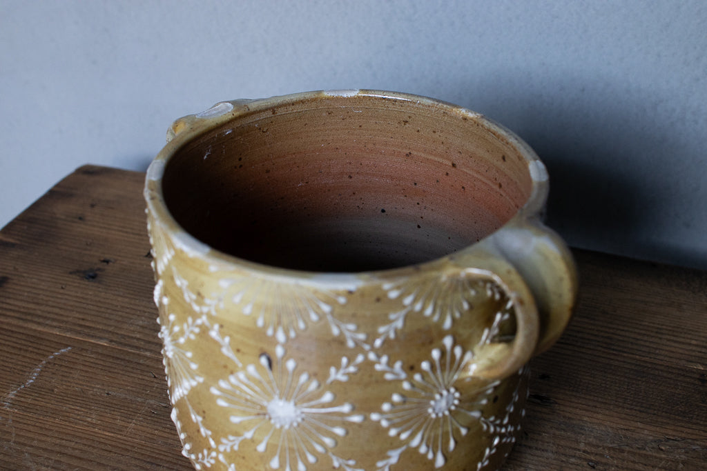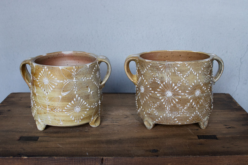 ayakaさんの土ものの植木鉢です。繊細なイッチンの柄と渋い質感が最高です。底穴はひとつ空いていますが鉢カバーとしても。