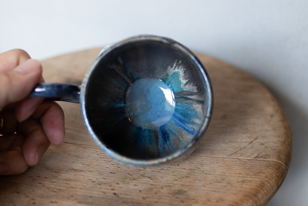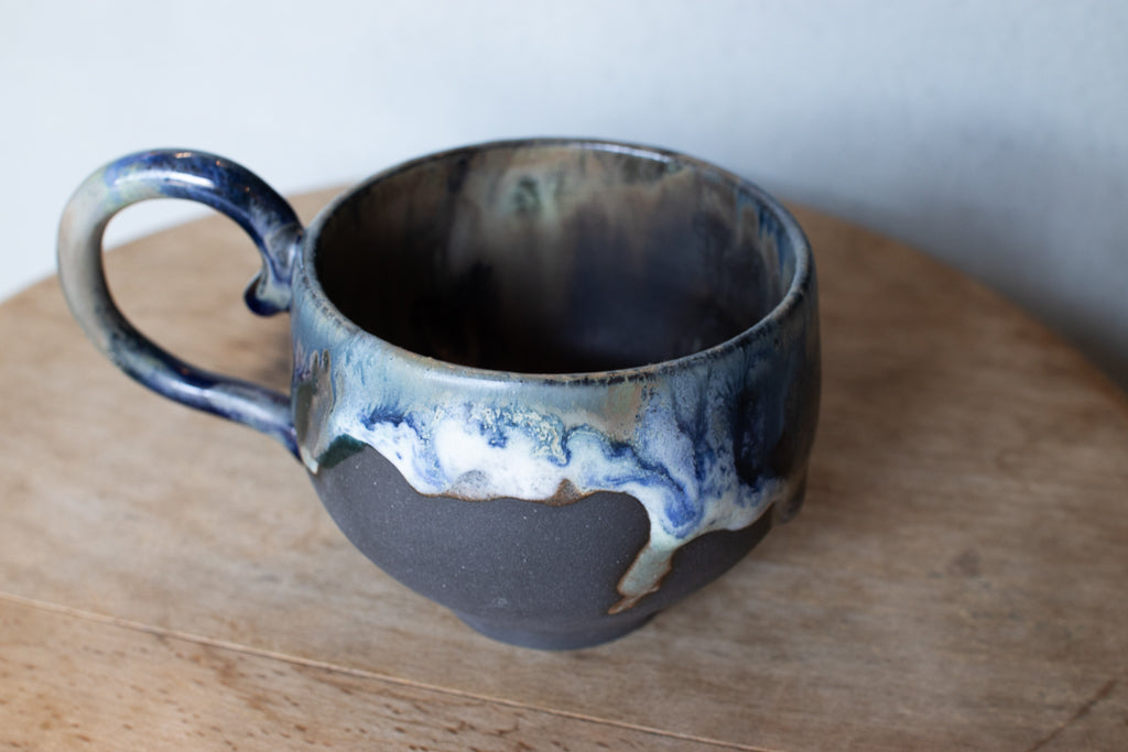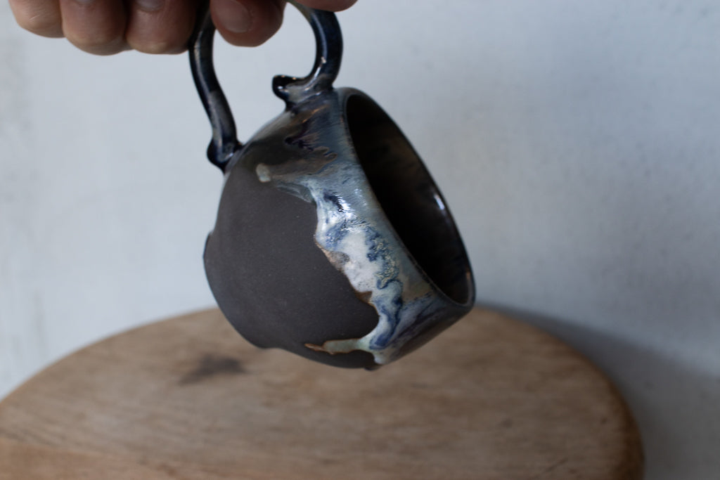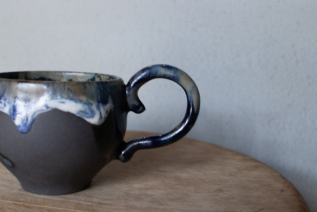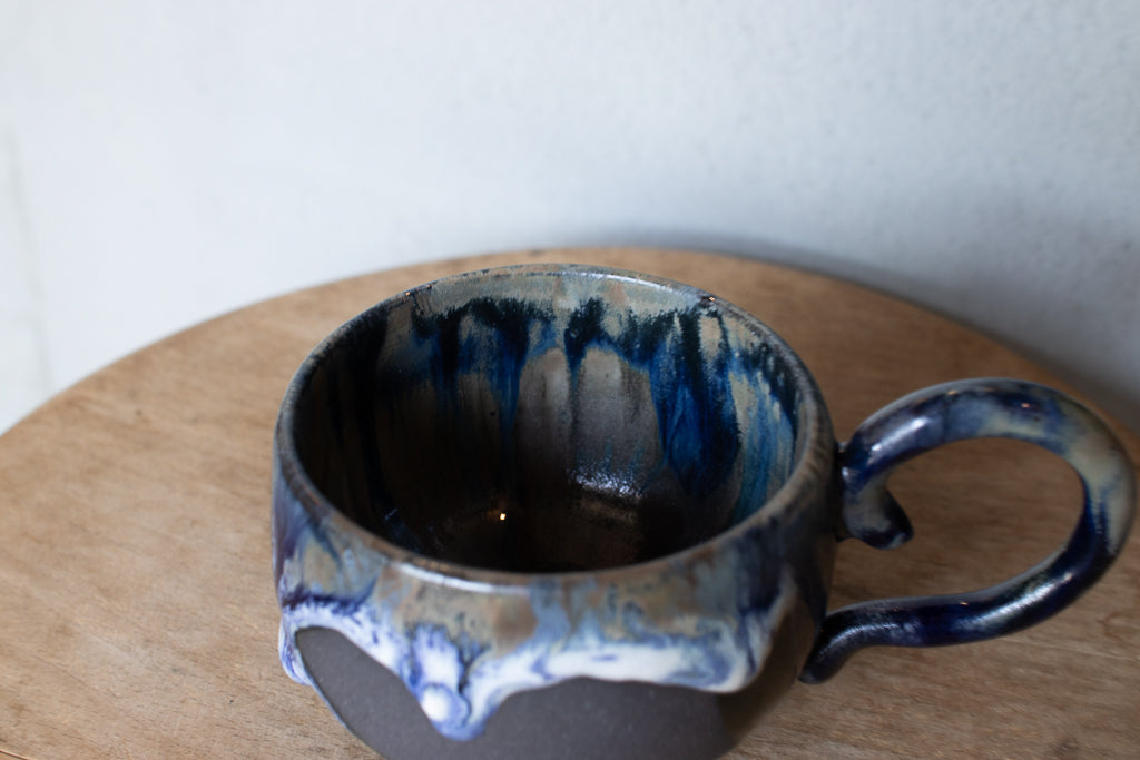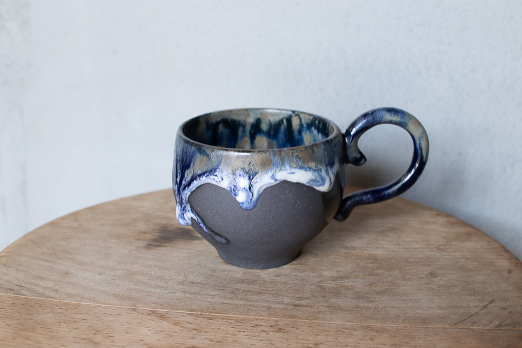 益子のAyaka Tabalaさんのマグカップ。「ふたつとして同じものを作らない」というポリシーで制作された作品です。こちらは最初期から作られている黒土に重厚な釉薬の流れが圧巻のシリーズ。