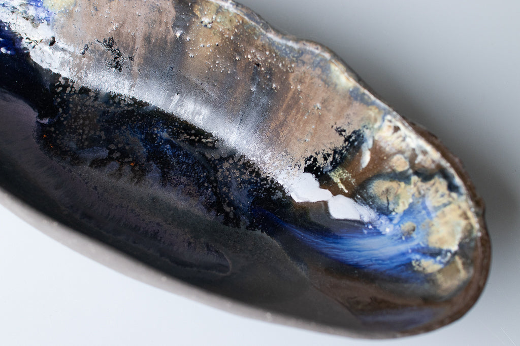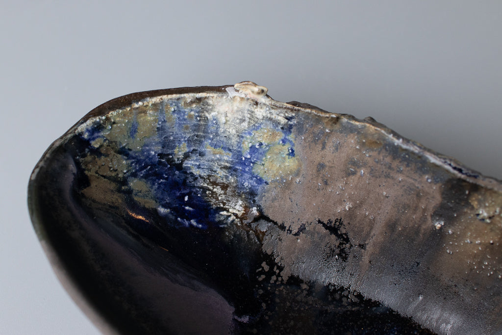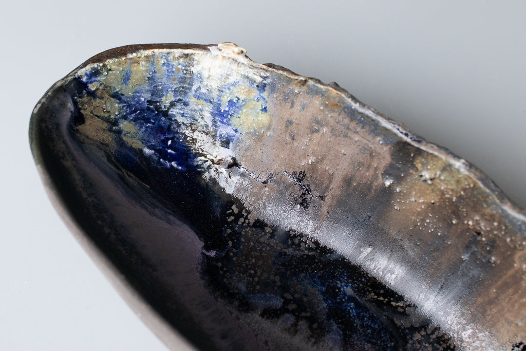 こちらは黒のラインの作品。マットな黒ベースに複雑な釉薬の重ね掛け。細長いユニークな形で食卓の良いアクセントになってくれそうです。