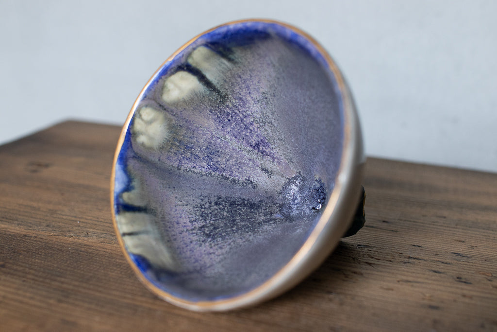 こちらは白のラインのフリーカップ・酒器。釉薬と銀彩の複雑なグラデーションが美しい。オブジェのような佇まいです。