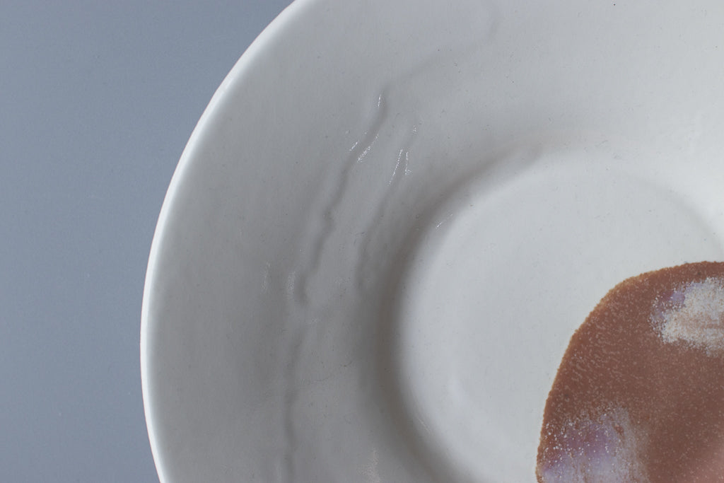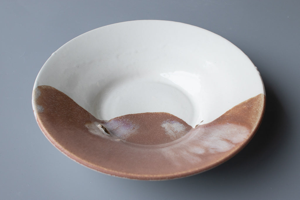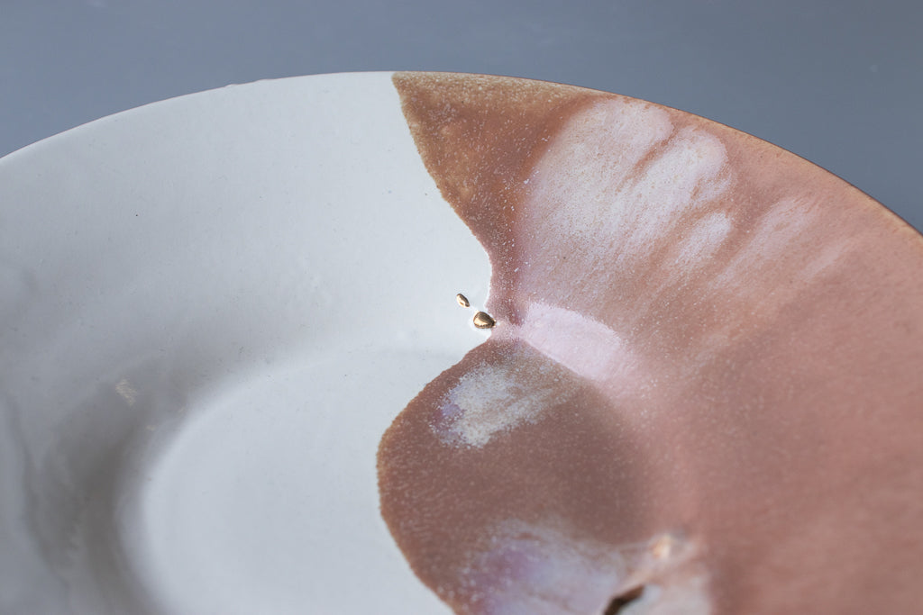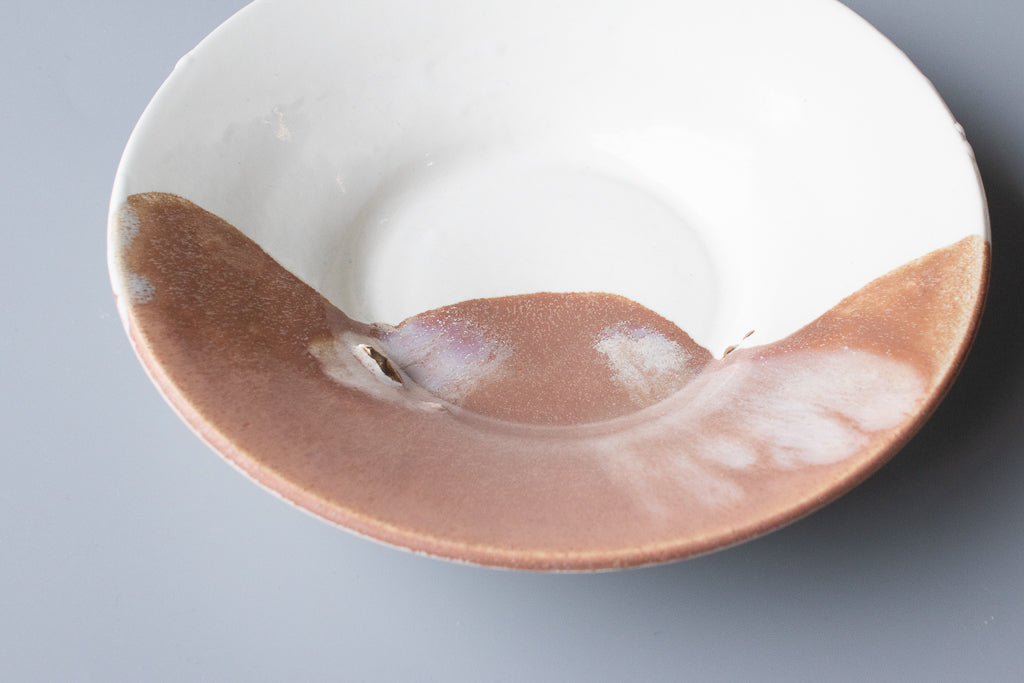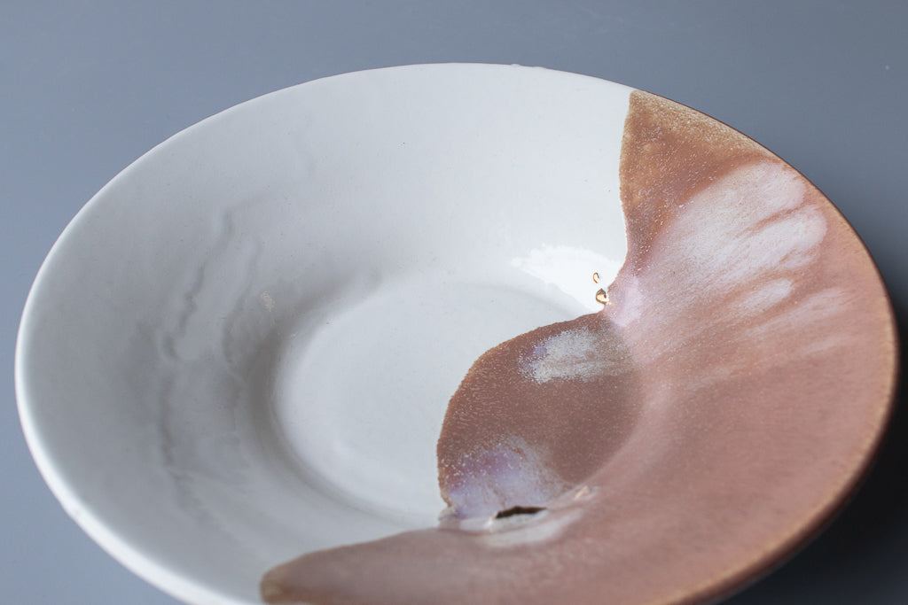 こちらは白のラインのリム鉢。非常にクリーンな印象の質感。朱色の釉薬とのツートーンの作品は特に珍しいです。ワンポイントの金彩によって唯一無二の存在感を放っています。