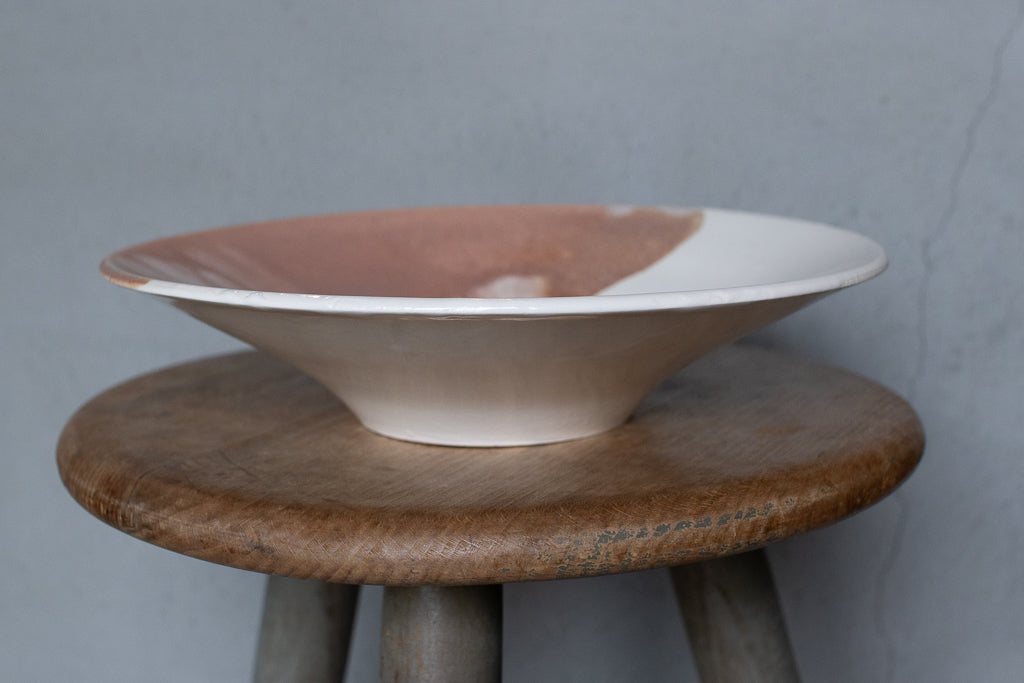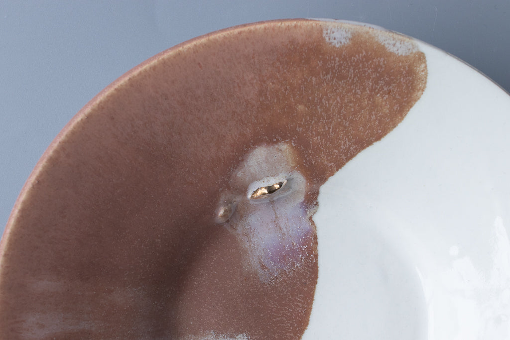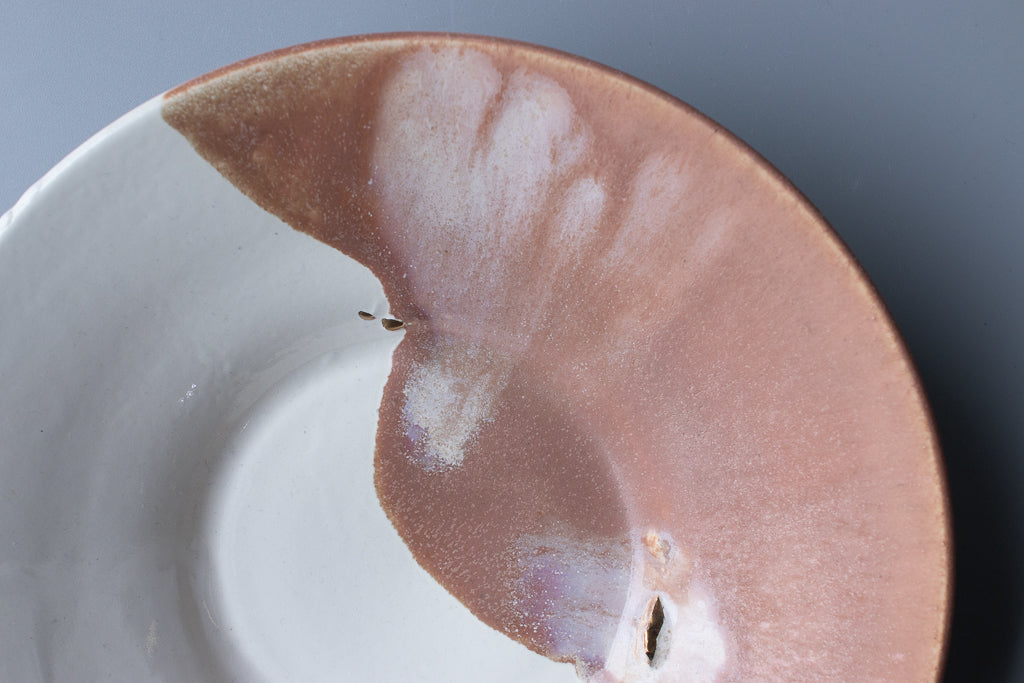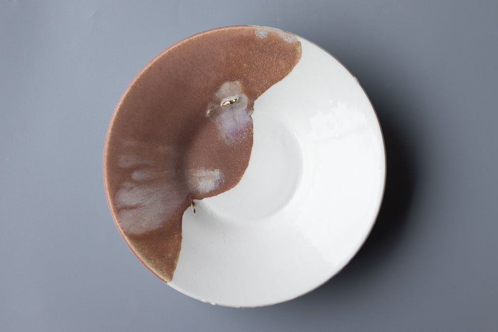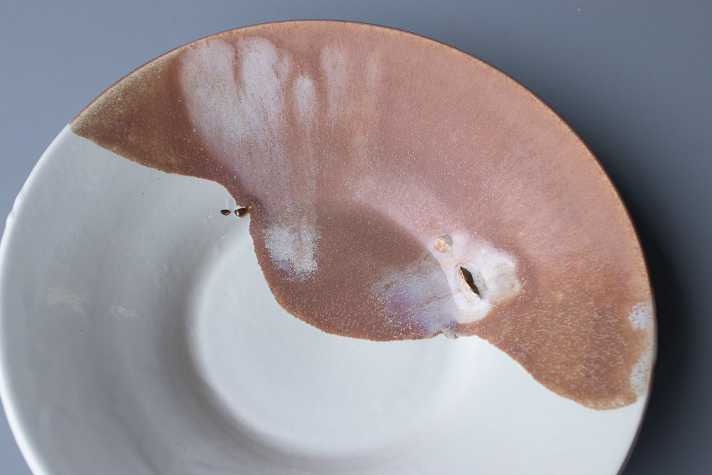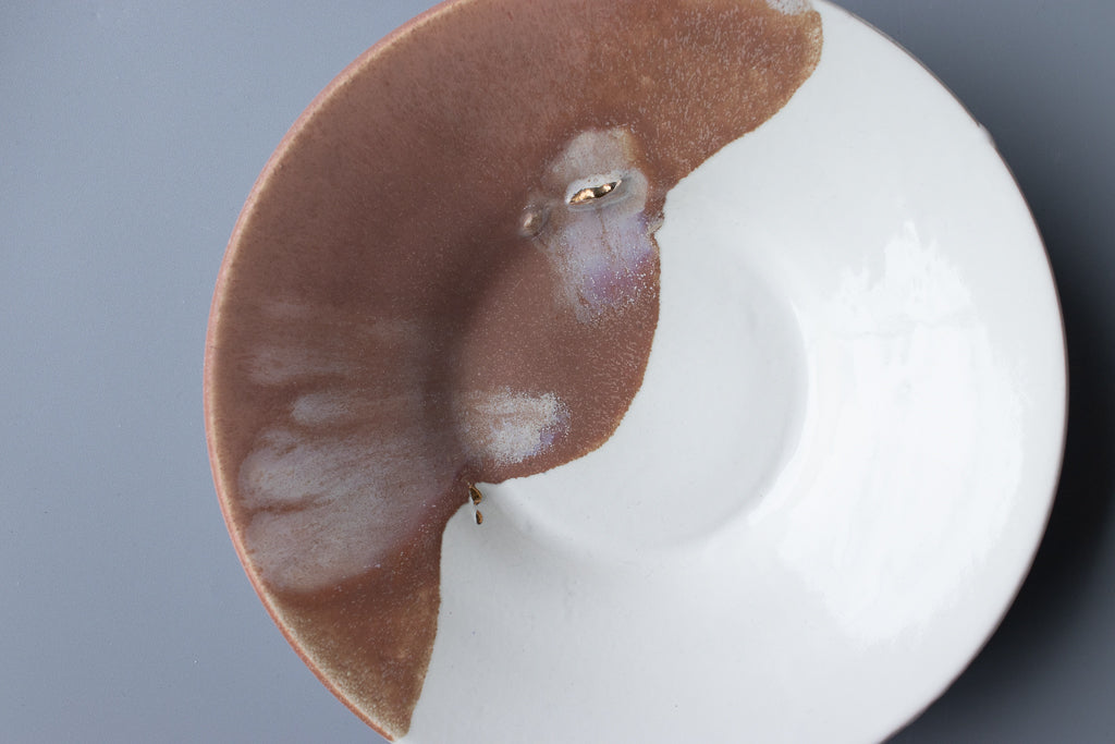 こちらは白のラインのリム鉢。非常にクリーンな印象の質感。朱色の釉薬とのツートーンの作品は特に珍しいです。ワンポイントの金彩によって唯一無二の存在感を放っています。